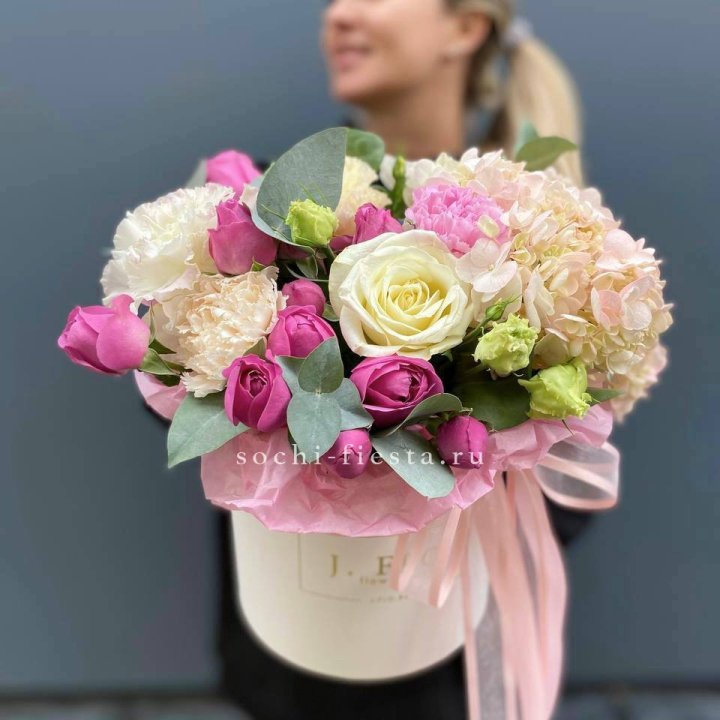 Цветочная корзина из пионов и пионовидных роз "Юниверсити"