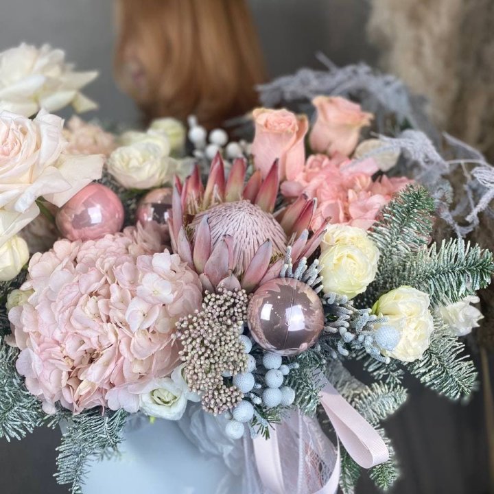 Новогодняя композиция в коробке пинк розе