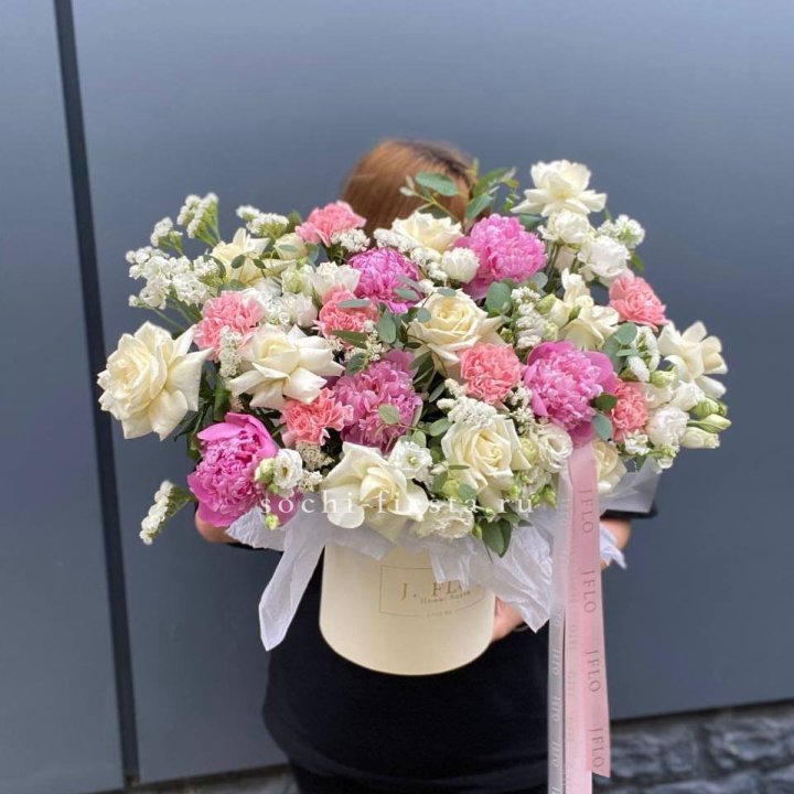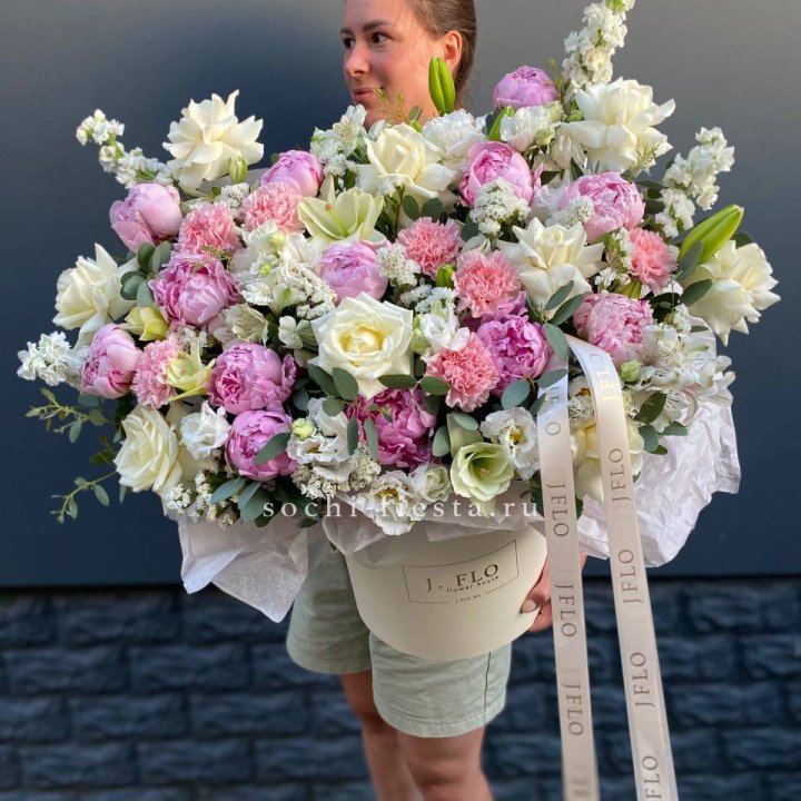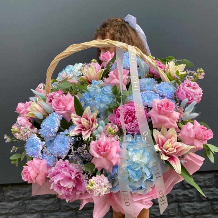 Цветочная корзина из пионов и пионовидных роз "Перфекте"