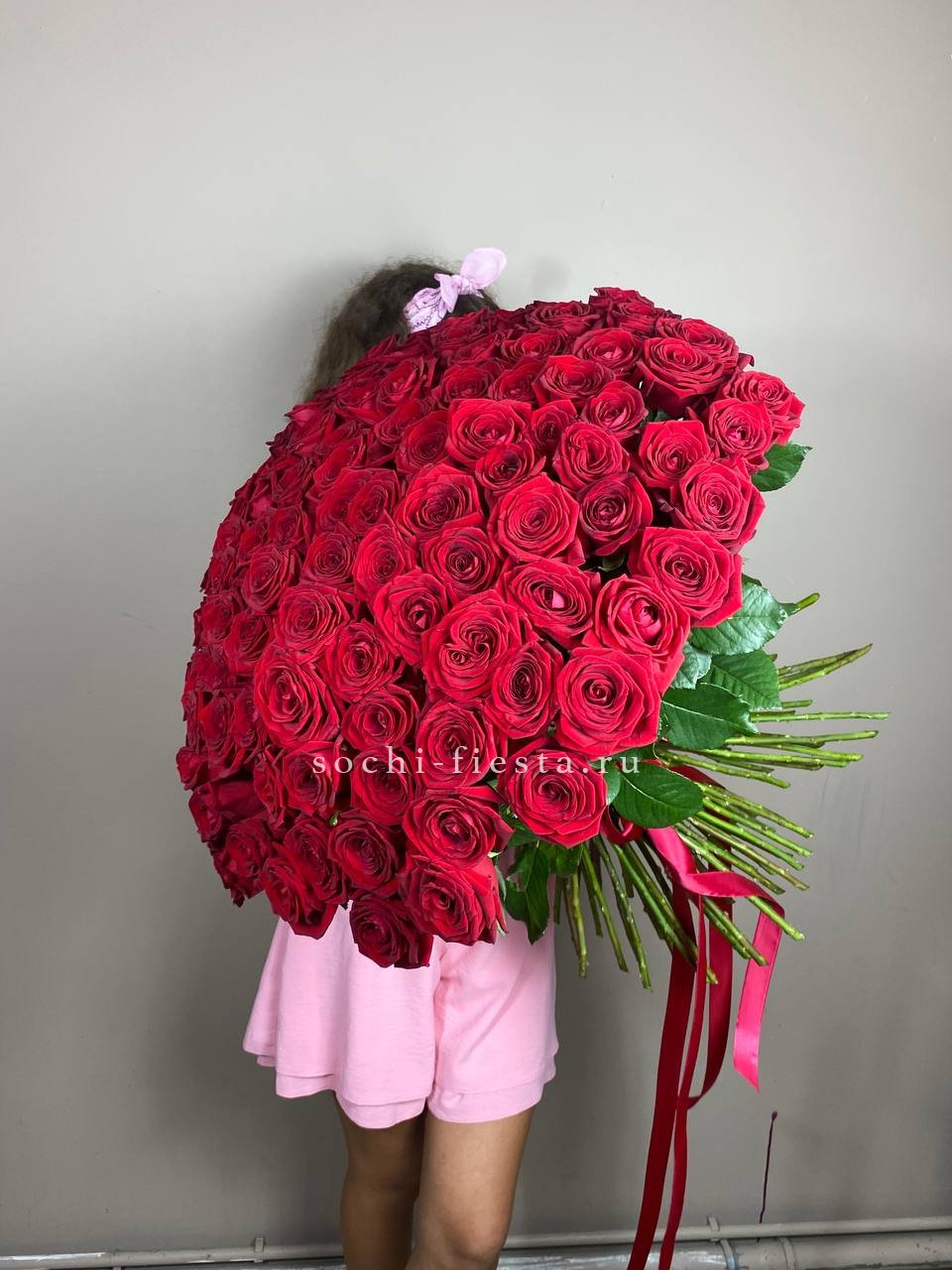 Сто одна голландская роза в букете — это история о масштабе и впечатлении. Объем композиции наполняет комнату и мгновенно притягивает внимание своим присутствием.