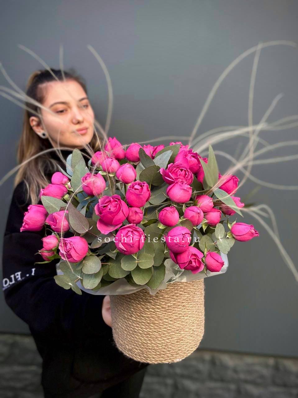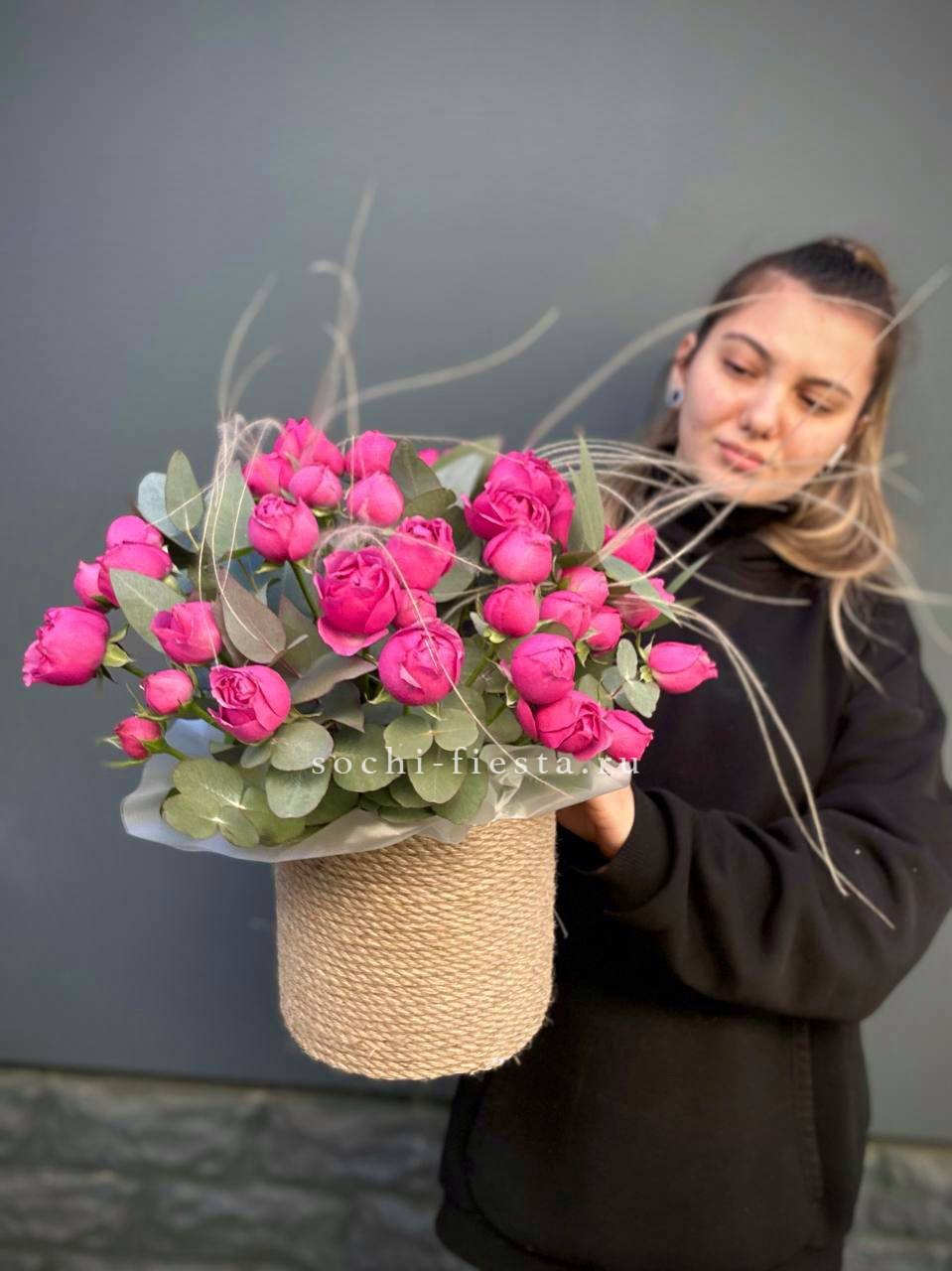 Одиннадцать французских роз выстроены в округлую композицию с веточками эвкалипта. Бутоны крупные и плотные, держат форму и наполняют пространство свежим присутствием.