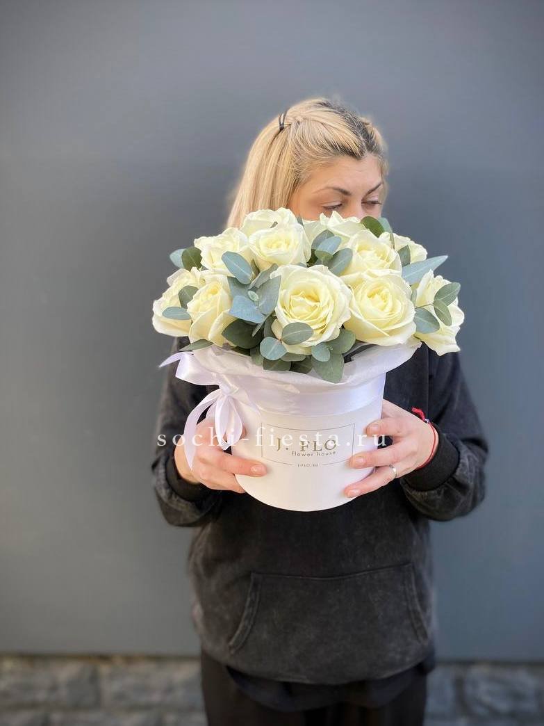 белые розы с эвкалиптом в боксе 16.