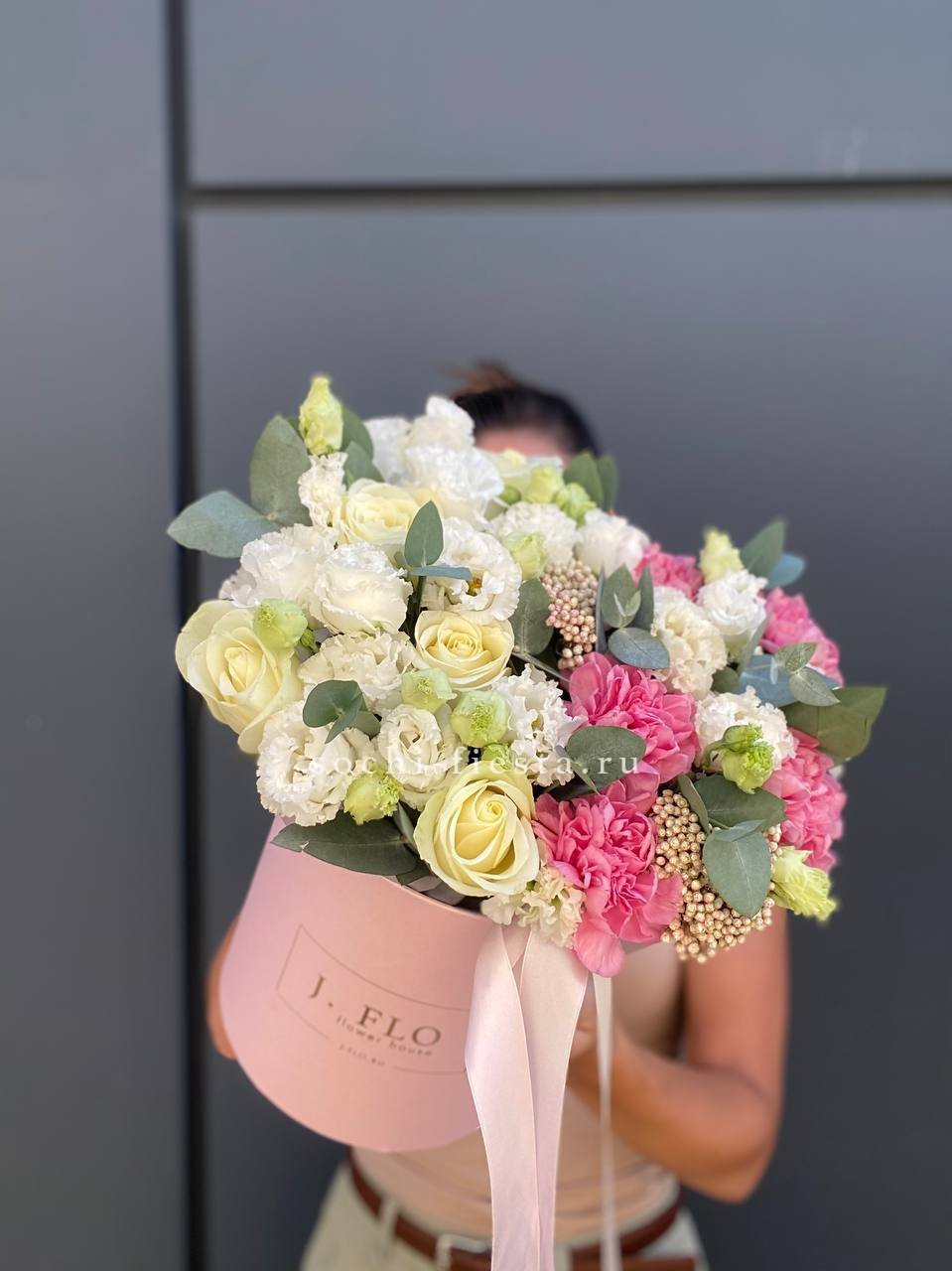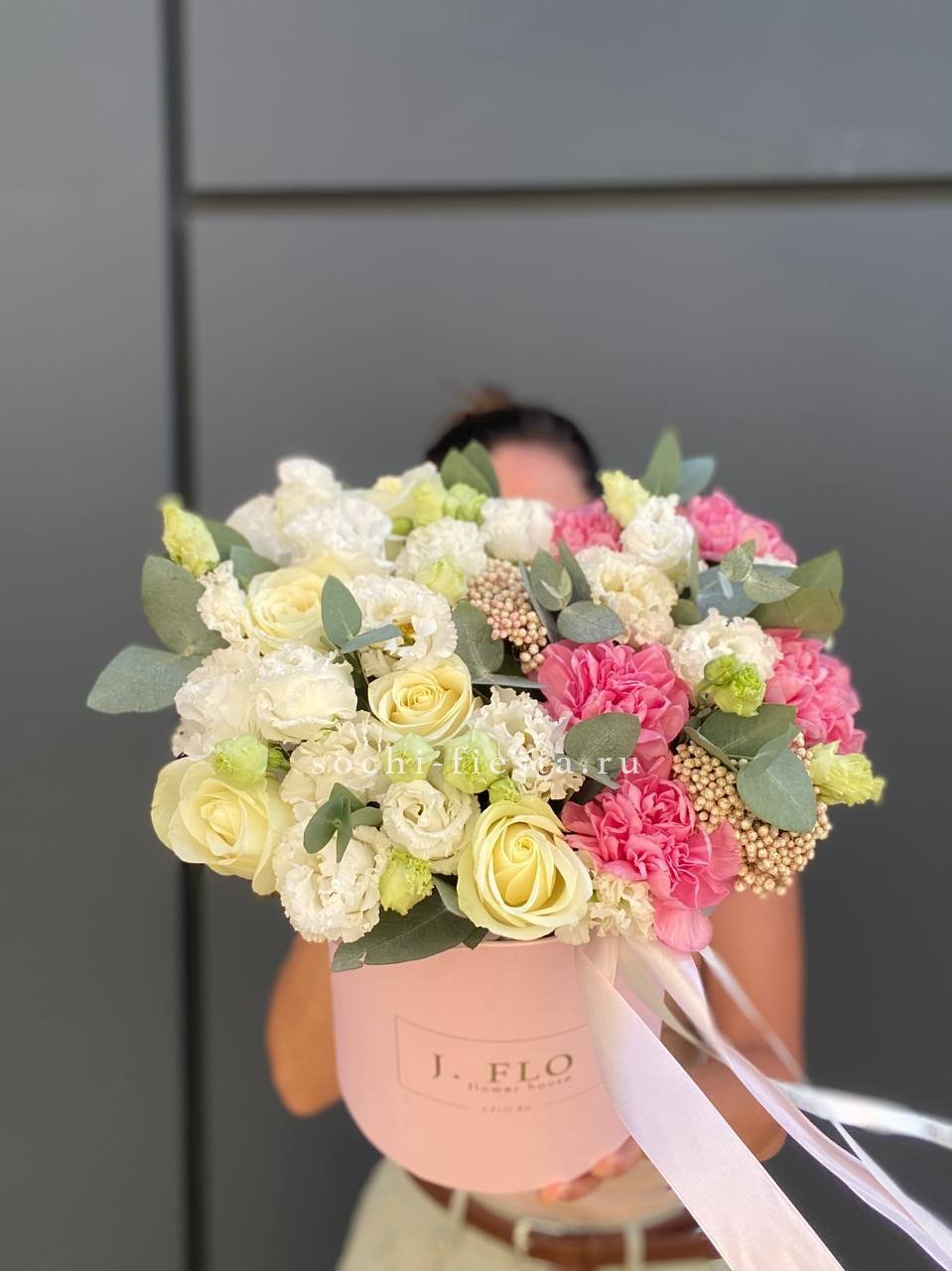 вывернутые розы, цилиндр D13, эвкалипт, лента, упаковка.