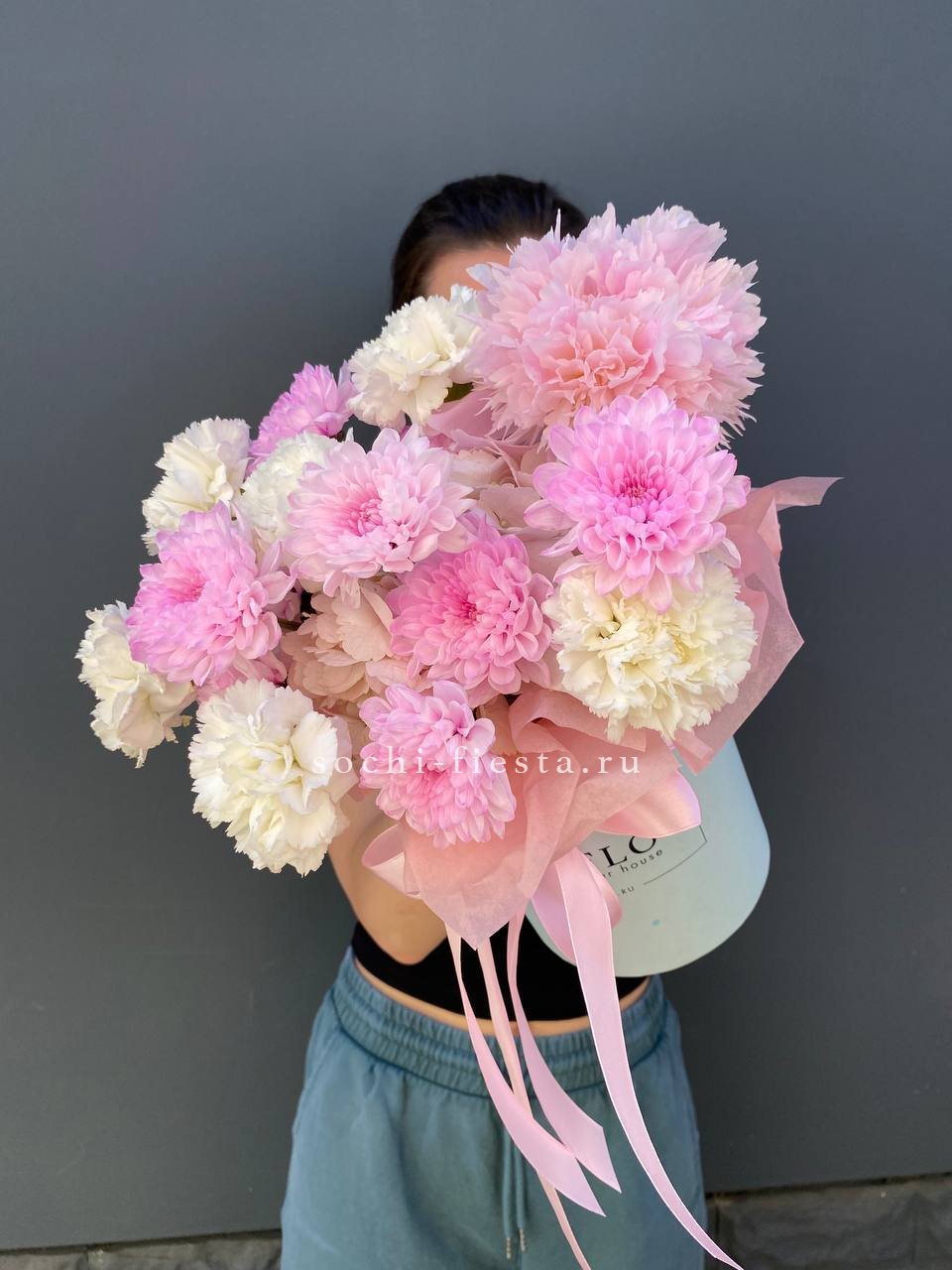 Белоснежные диантусы с пышными лепестками держат форму и долго сохраняют свежесть. Серебристый эвкалипт разбавляет плотность бутонов и добавляет прохладные нотки в композицию.