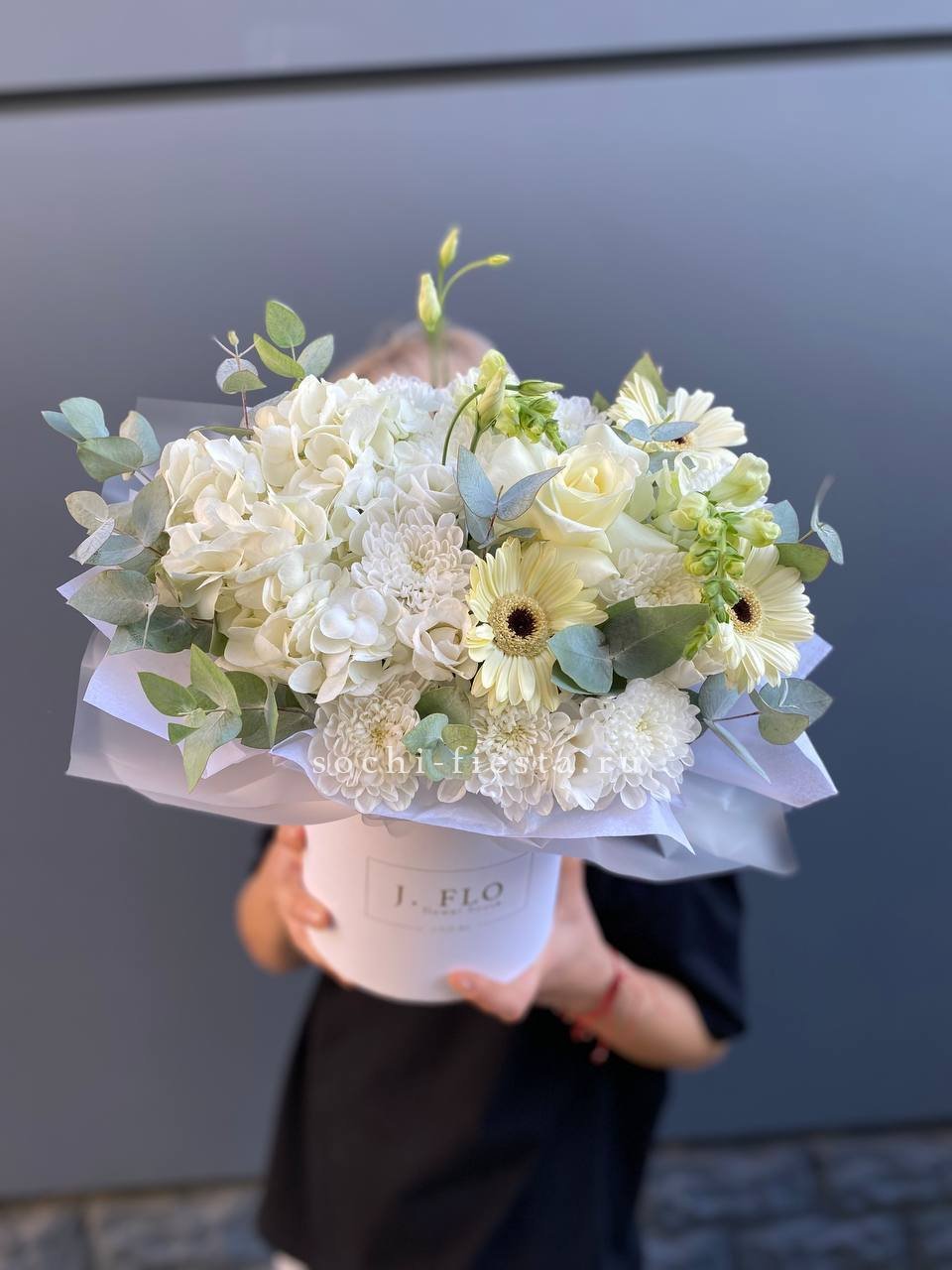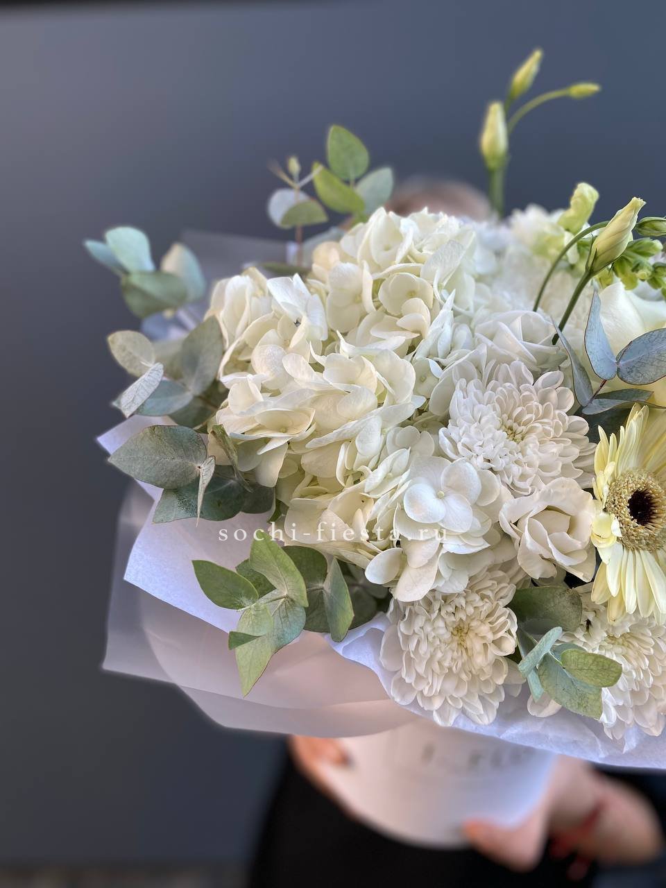 Белоснежные бутоны собраны в лаконичную форму с воздушной текстурой упаковки. Чистота линий и свежесть делают композицию универсальной для любого момента.