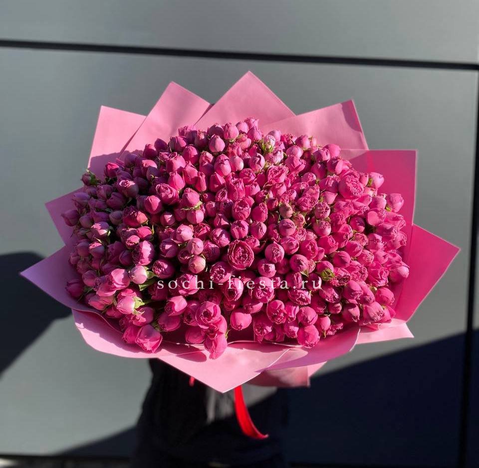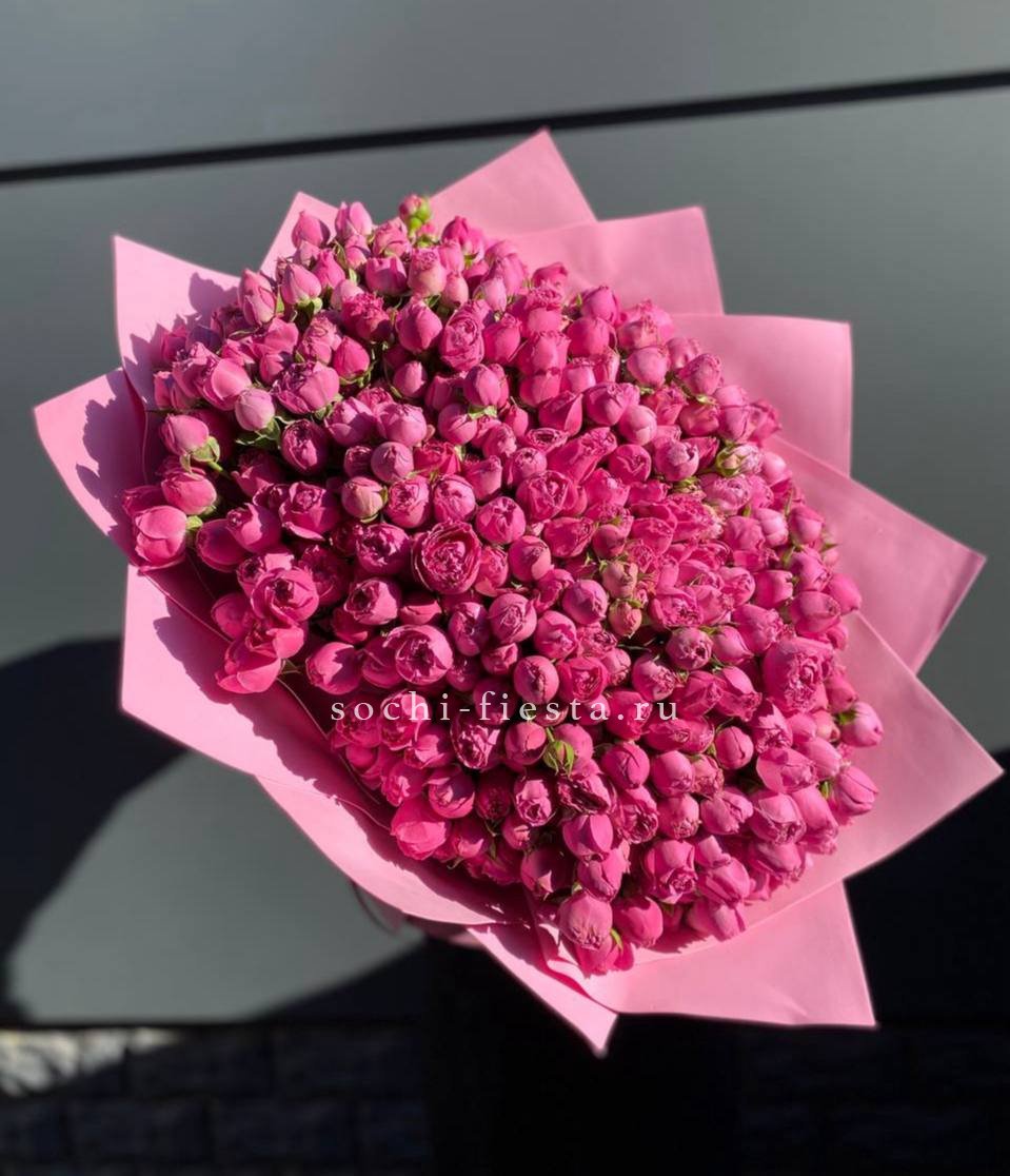 Пятьдесят пять бутонов создают объемную композицию с выразительным силуэтом. Розовый цвет наполняет пространство светом. Авторское оформление завершает образ.