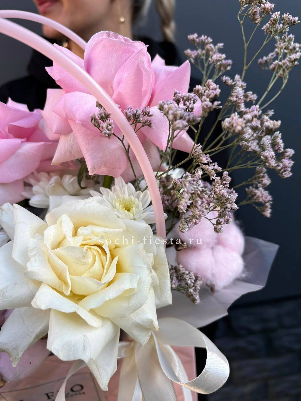 Мисти Баблс и гортензии в воздушной упаковке дарят ощущение свежести раннего утра. Лёгкая структура букета сохраняет форму и долго радует глаз.