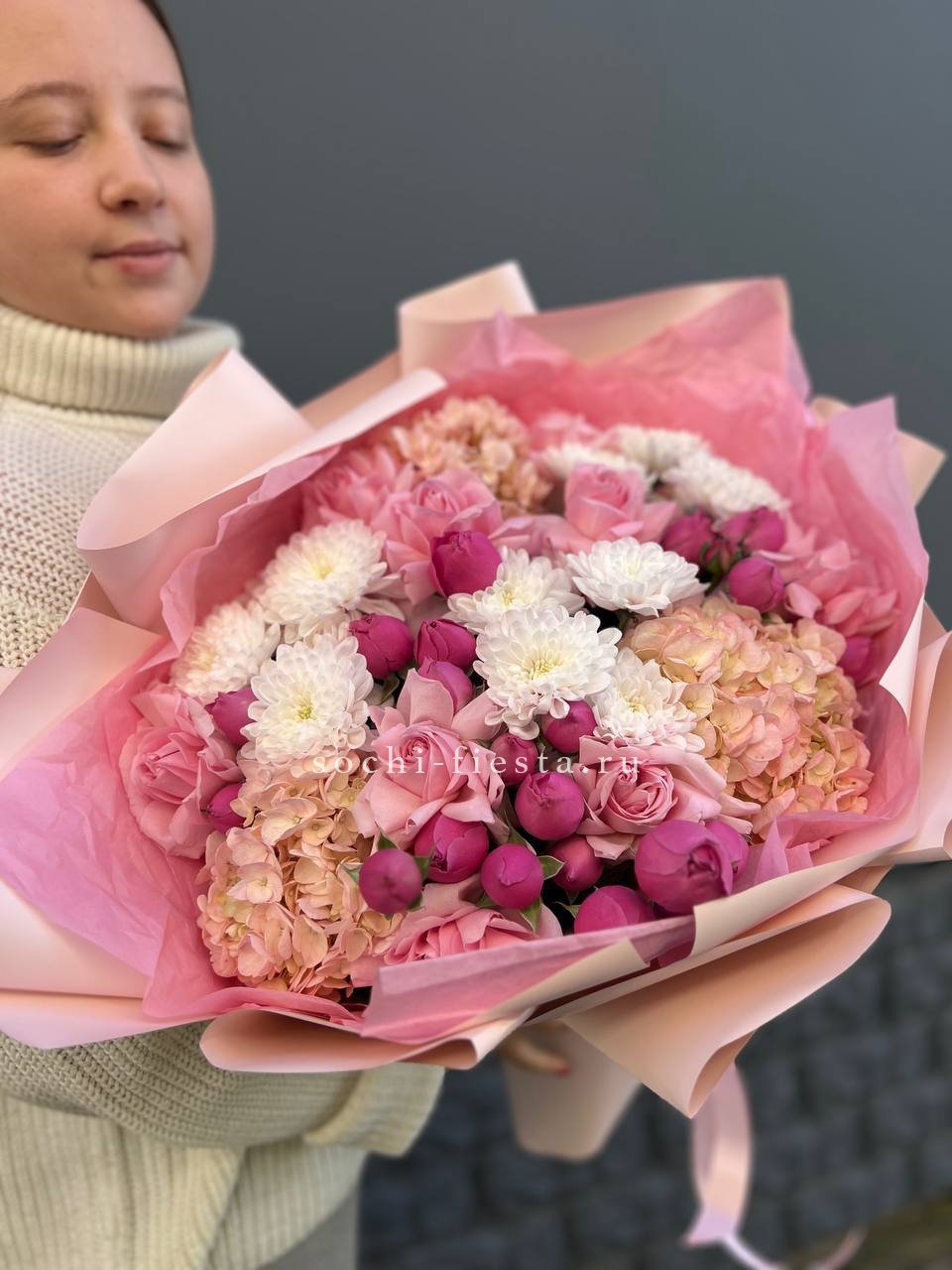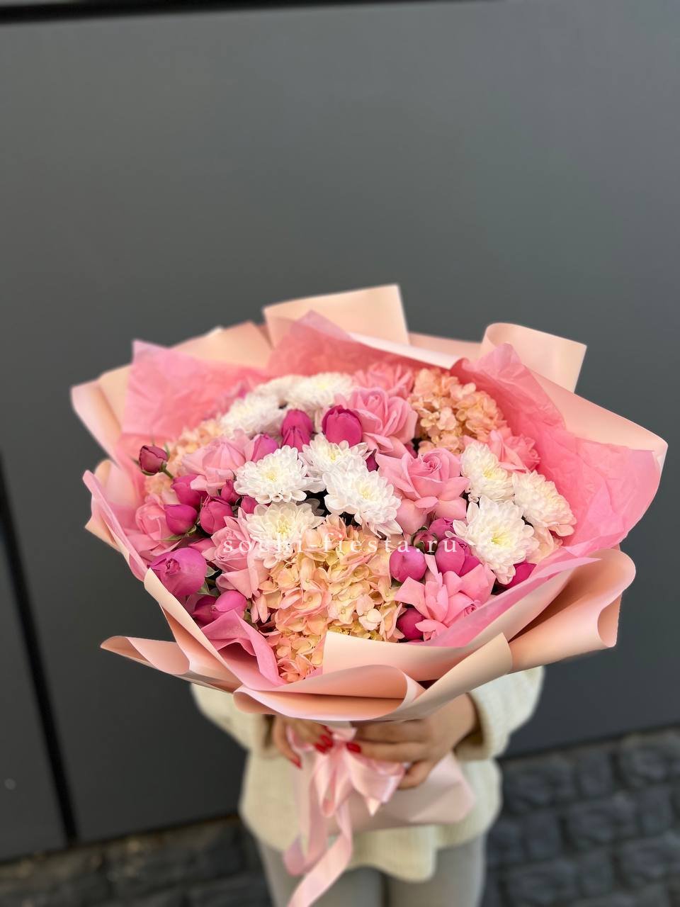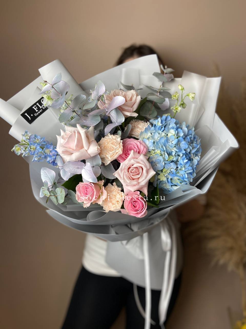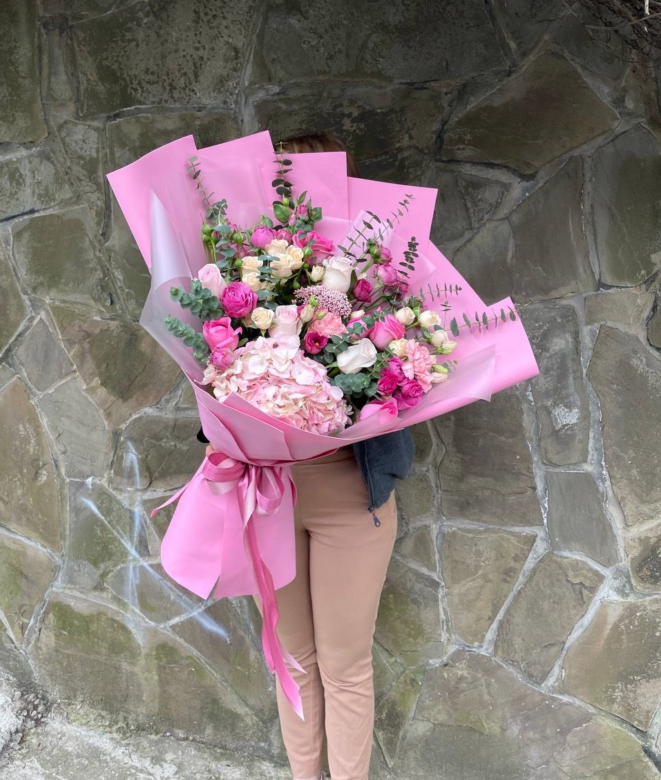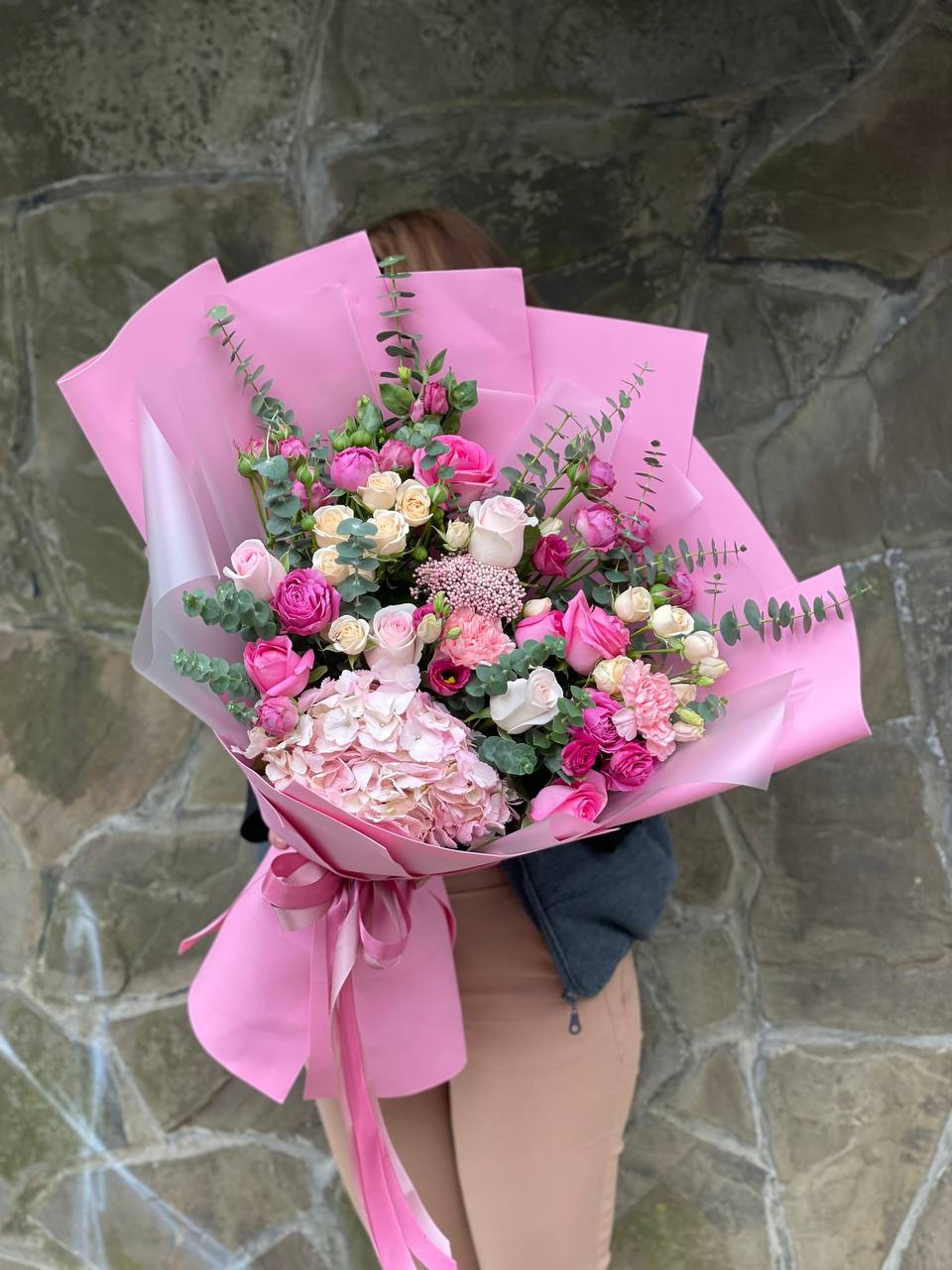 гортензия, розовые розы, диантусы, эустома, маттиолы, эвкалипт лента и дизайнерская пленка.