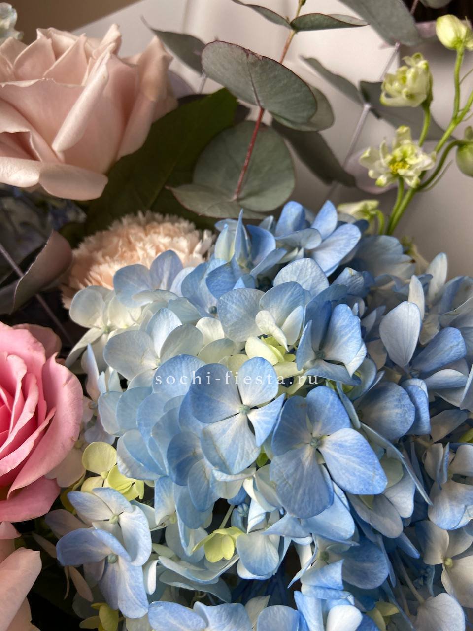 Пышная шапка гортензии переходит в розовые розы и маттиолы, создавая многослойную структуру. Эвкалипт обрамляет композицию, добавляя графичности и свежести.