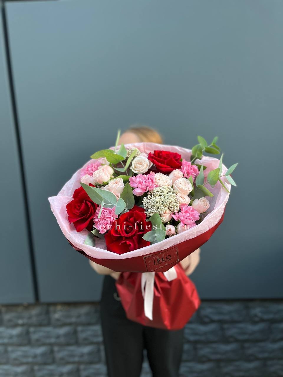 красная француская роза, диантусы, бомбастик, озатамус, эвкалипт, упаковка.