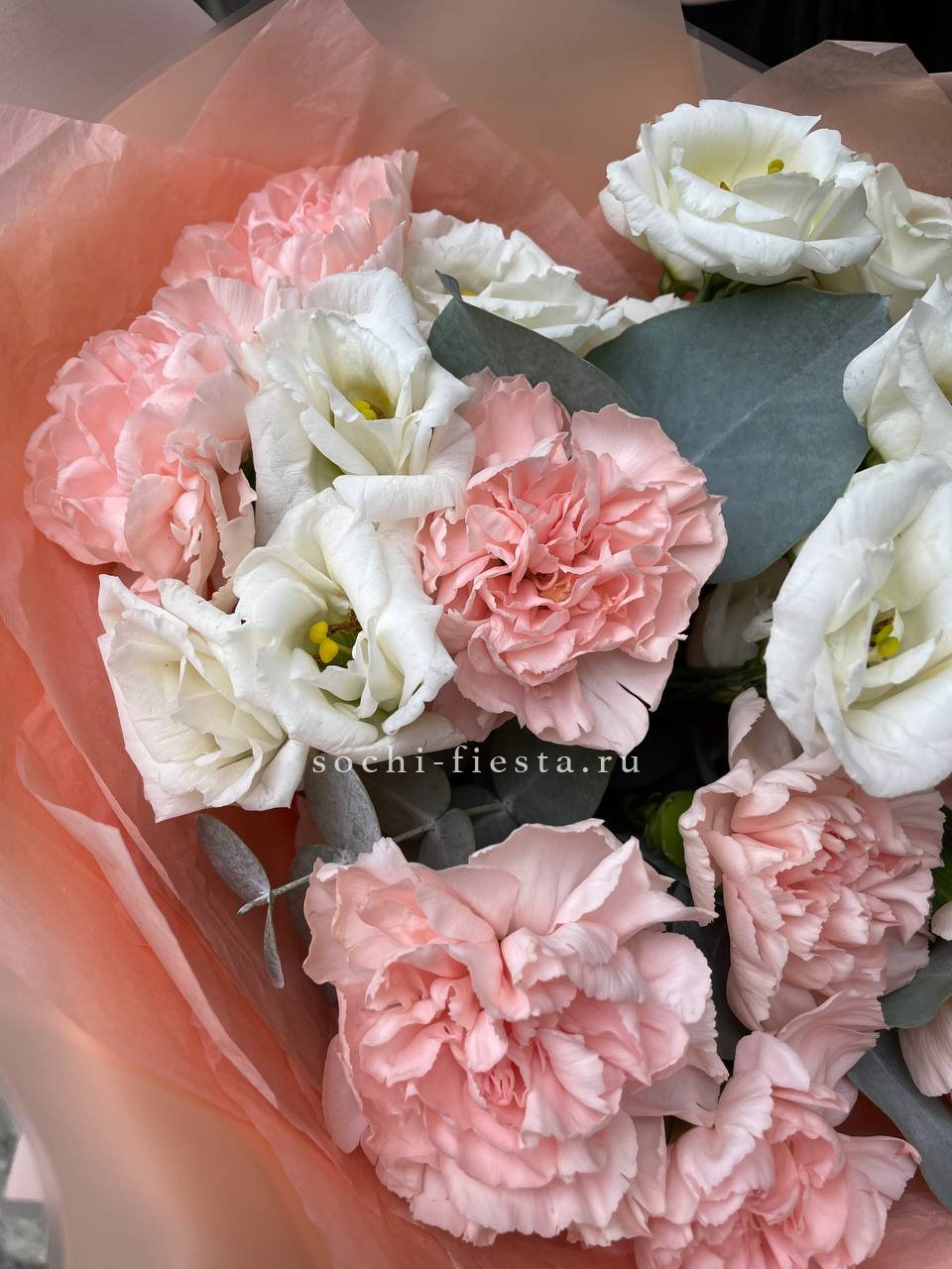 диантус, эустома, эвкалипт,  лента, дизайнерская пленка.