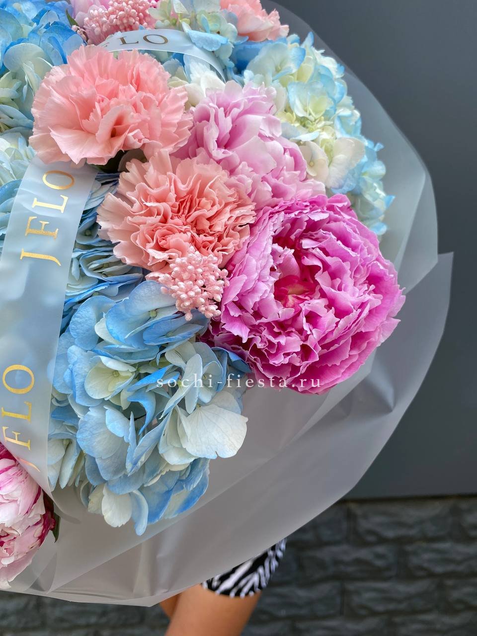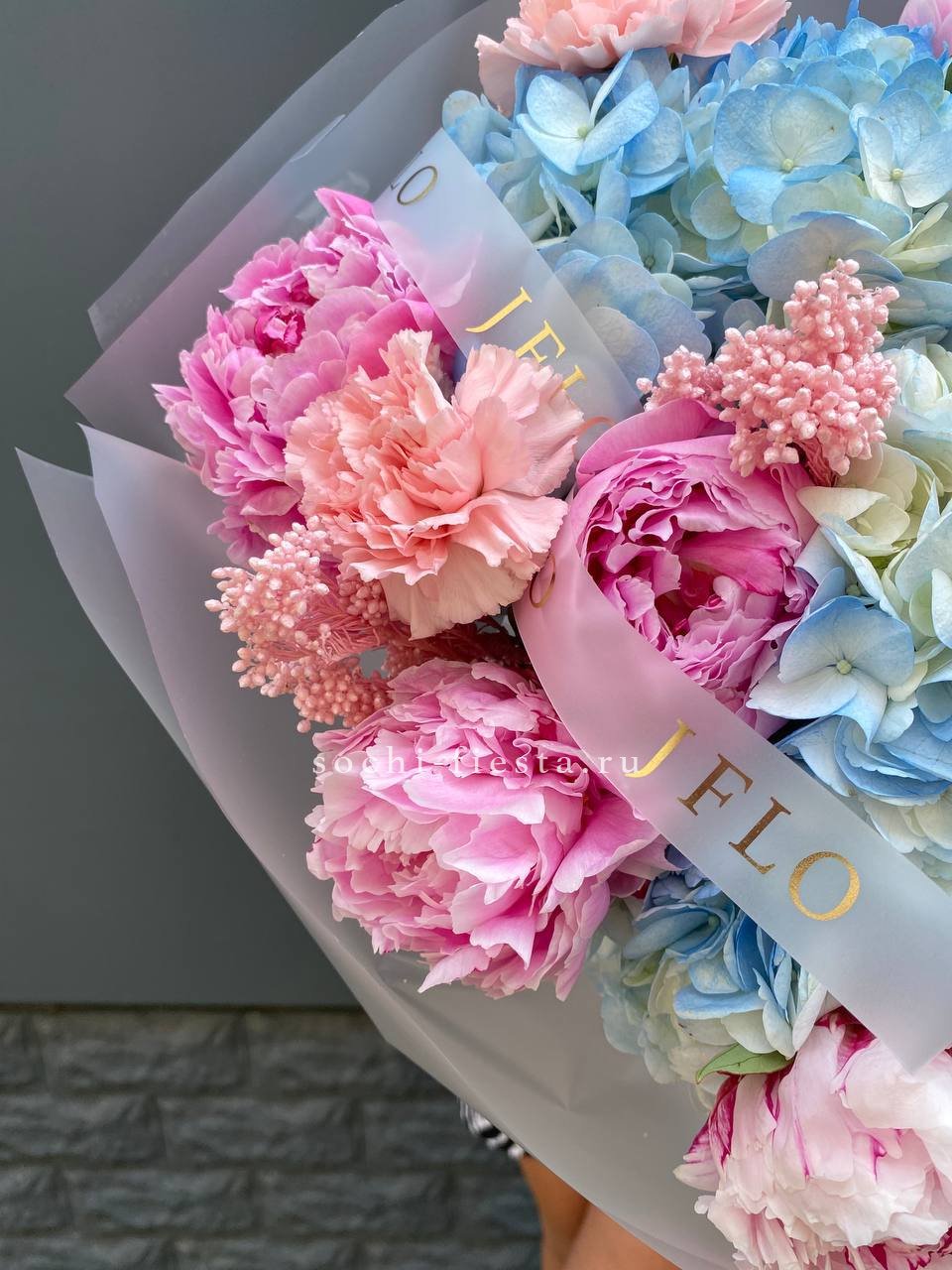 пионы, озатамус, гортензии, диантусы, лента и дизайнерская пленка.