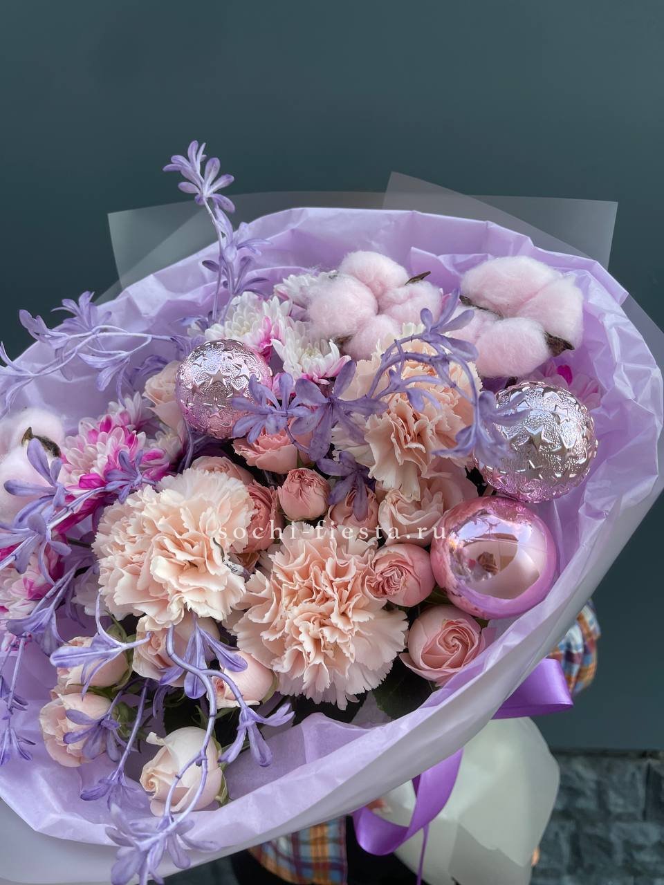 Сиреневые хризантемы и диантус выстраиваются в плотную композицию с новогодним декором. Бомбастик и хлопок создают фактурные переходы между цветами. Букет наполнен праздничным духом и зимней свежестью.