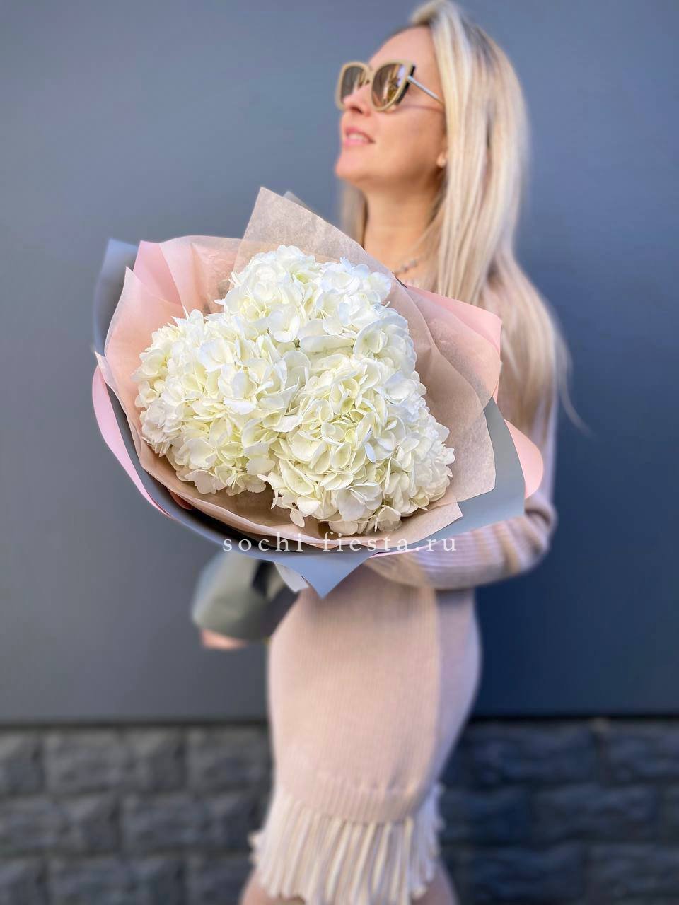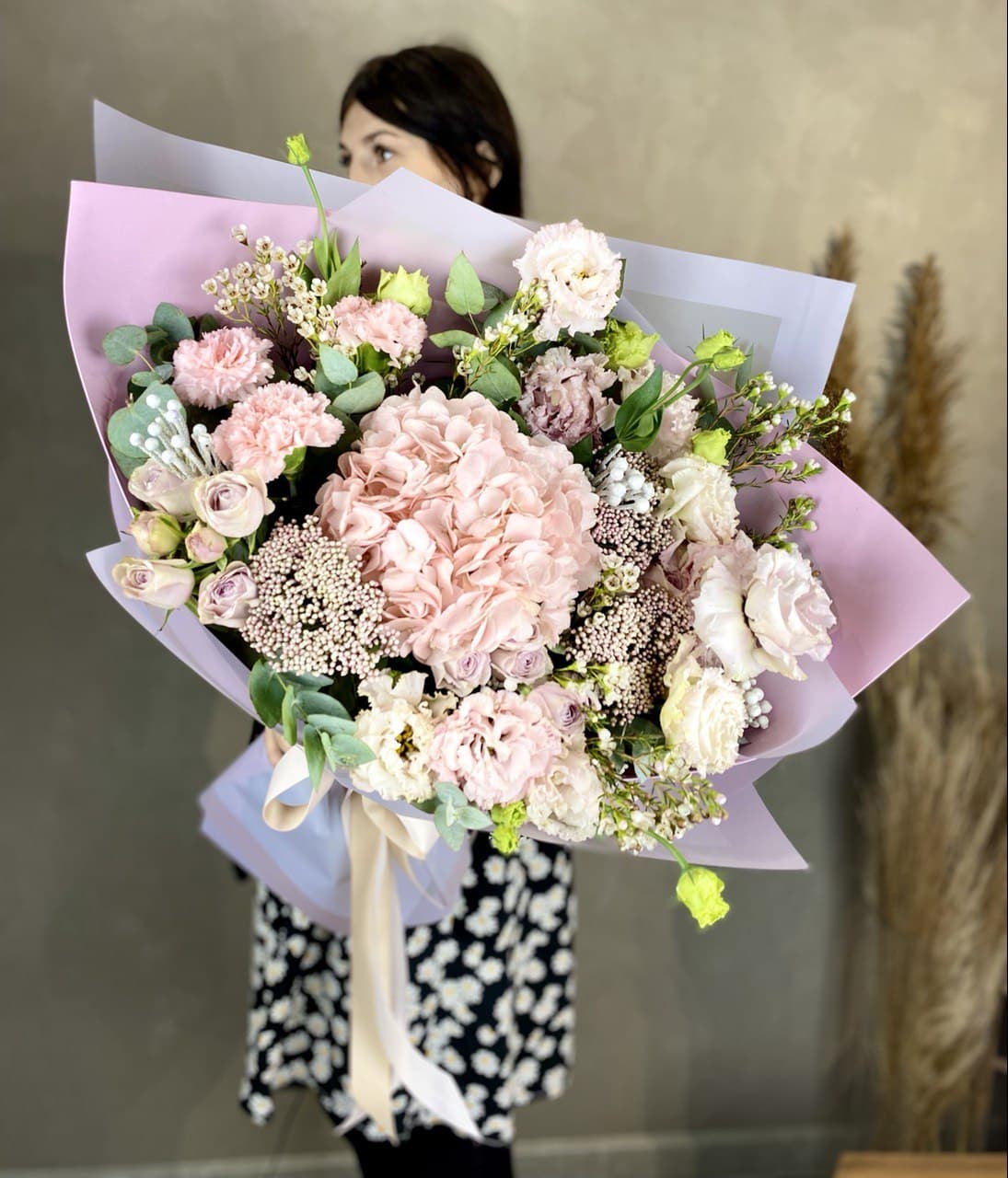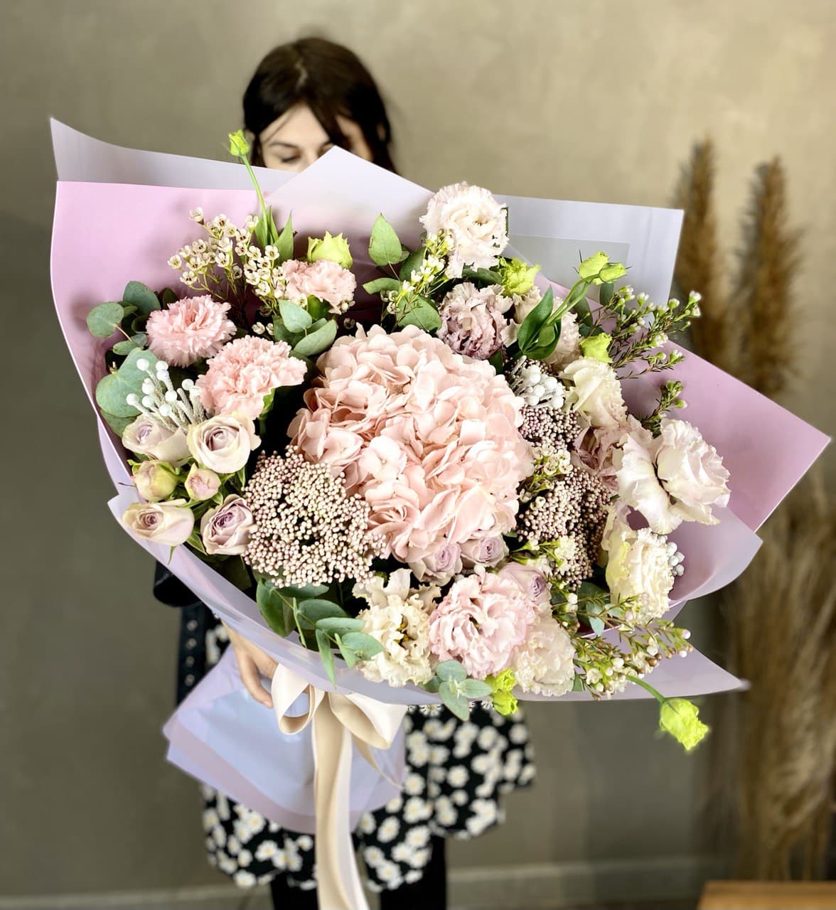 гортензия, хризантема, хамелациум, гербера, мисти баблс, диантус, пленка.