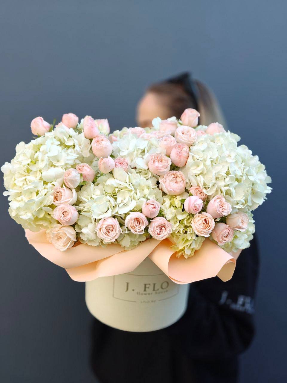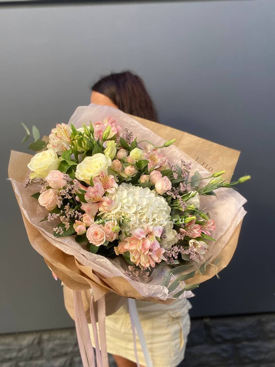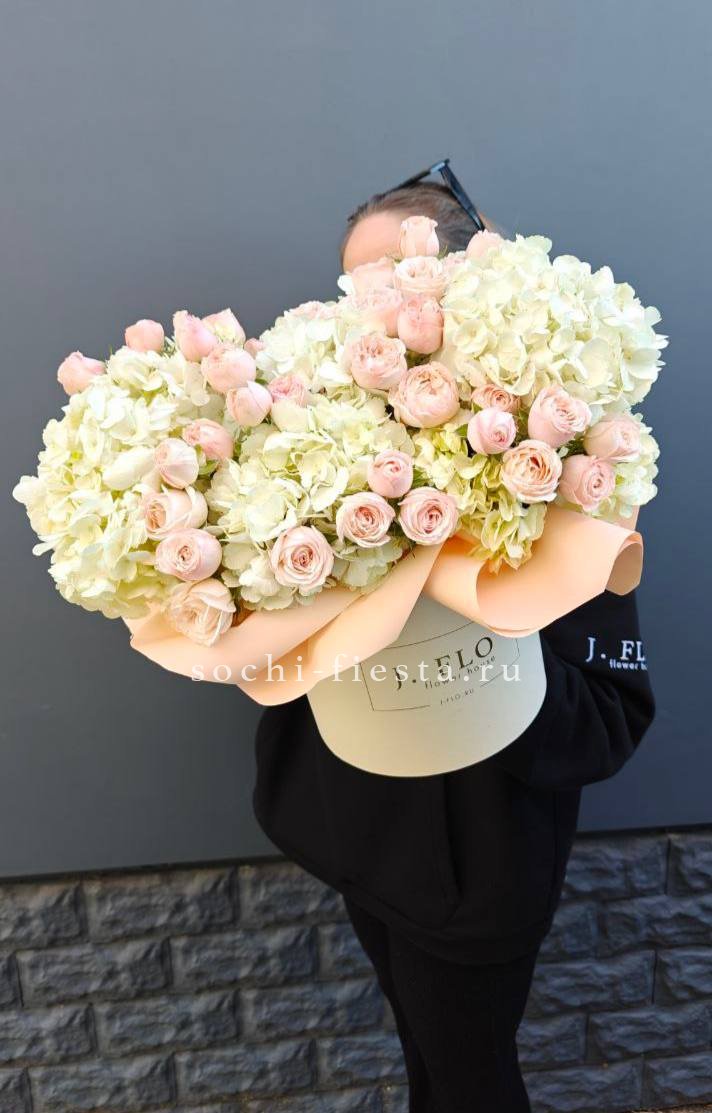 Воздушная композиция с крупными соцветиями гортензии и пышными розами создает ощущение легкости и объема. Эвкалипт добавляет свежести, а бомбастик расставляет яркие акценты между бутонами.