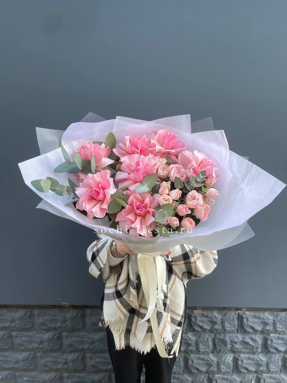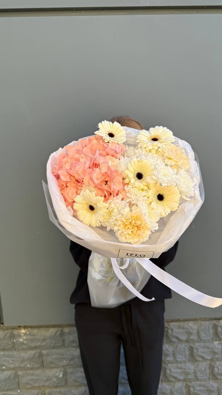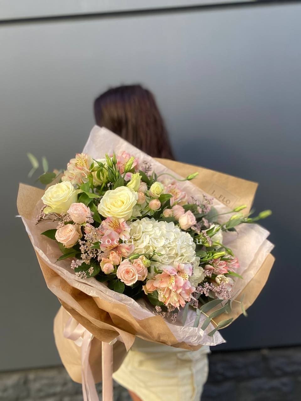 Воздушная композиция с крупными соцветиями гортензии и пышными розами создает ощущение легкости и объема. Эвкалипт добавляет свежести, а бомбастик расставляет яркие акценты между бутонами.
