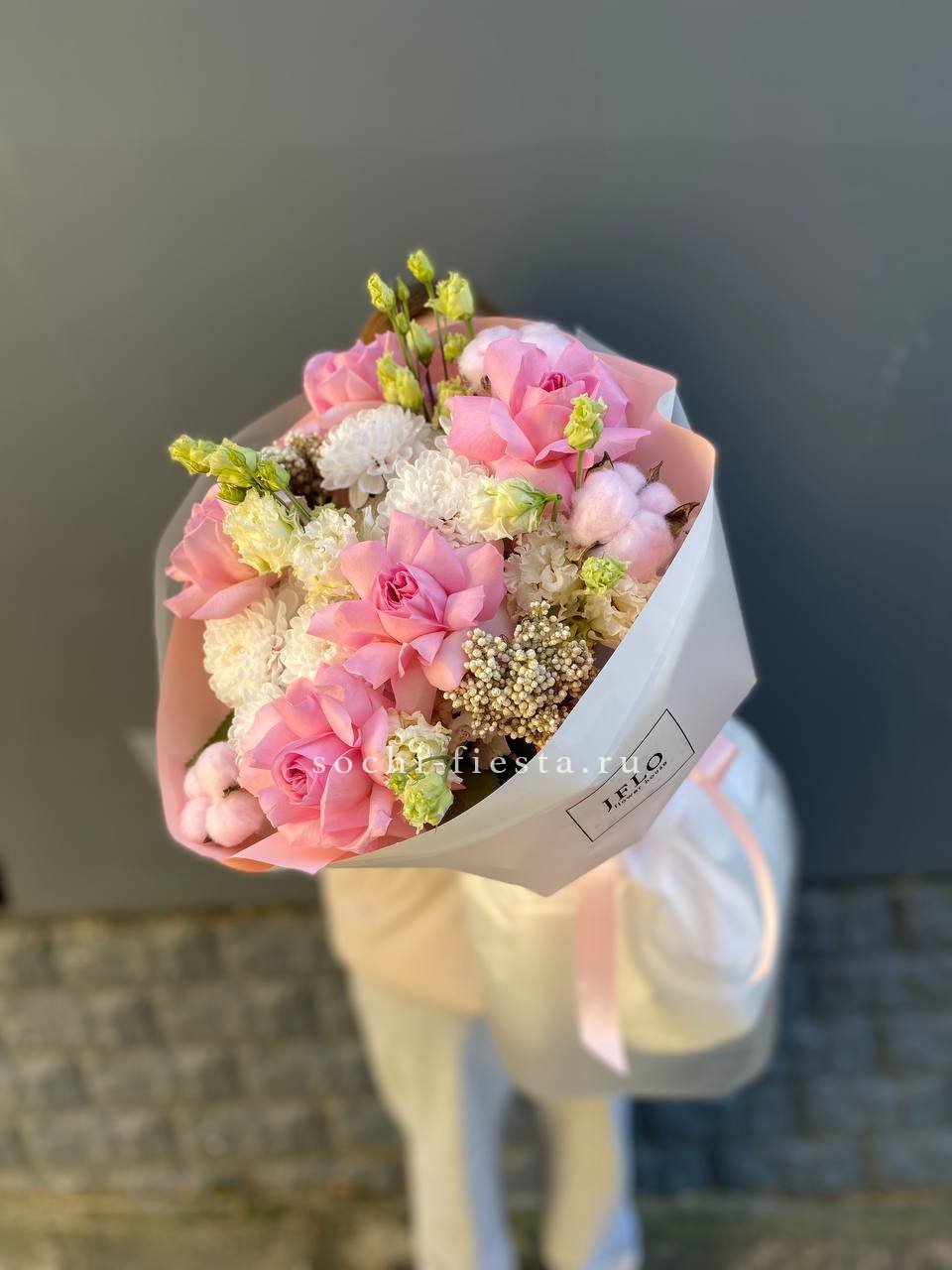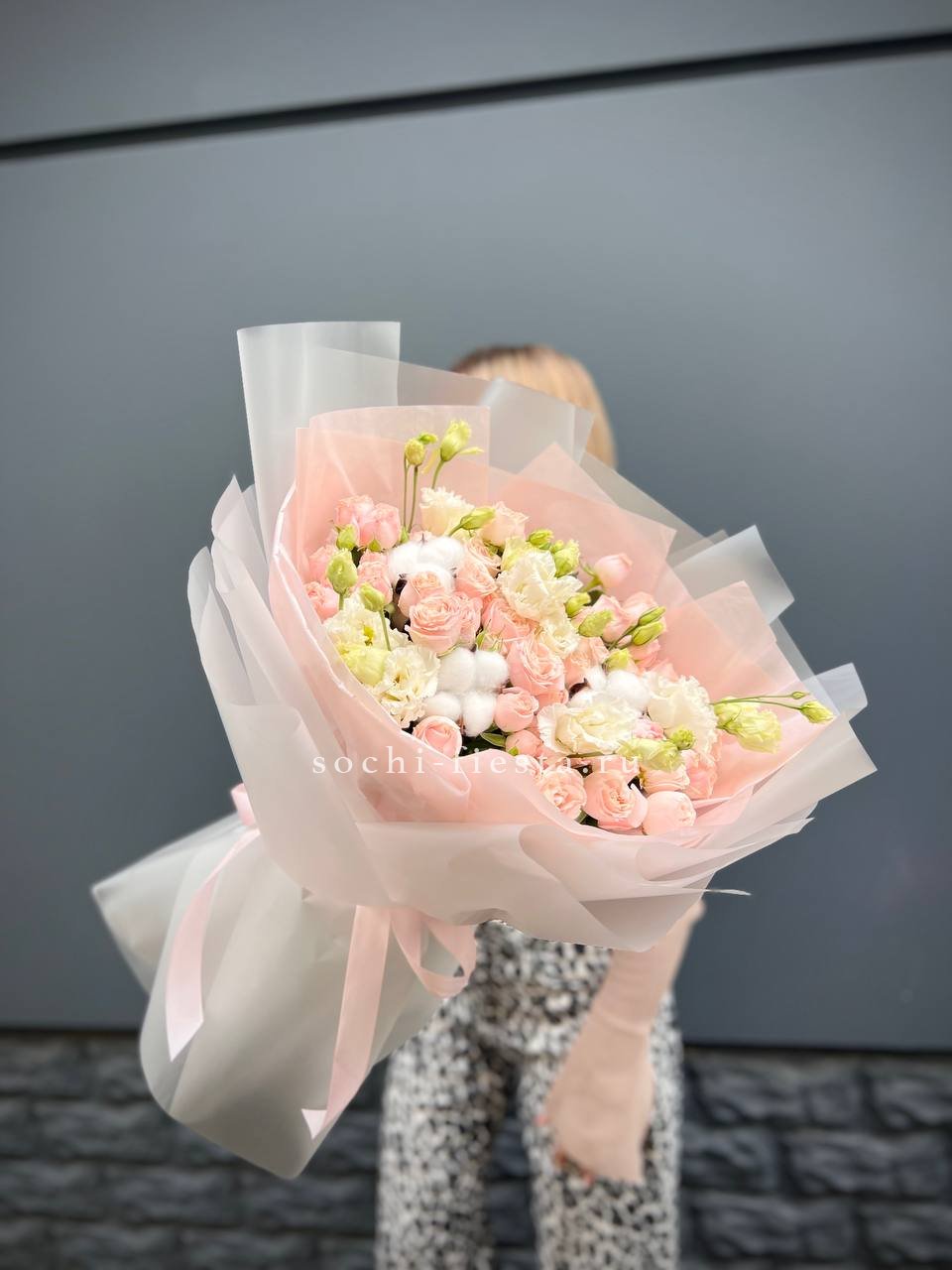 Кустовые розы и эустомы собраны в компактную форму с мягкими линиями. Сочетание нескольких оттенков создаёт живописный эффект без лишней пышности.