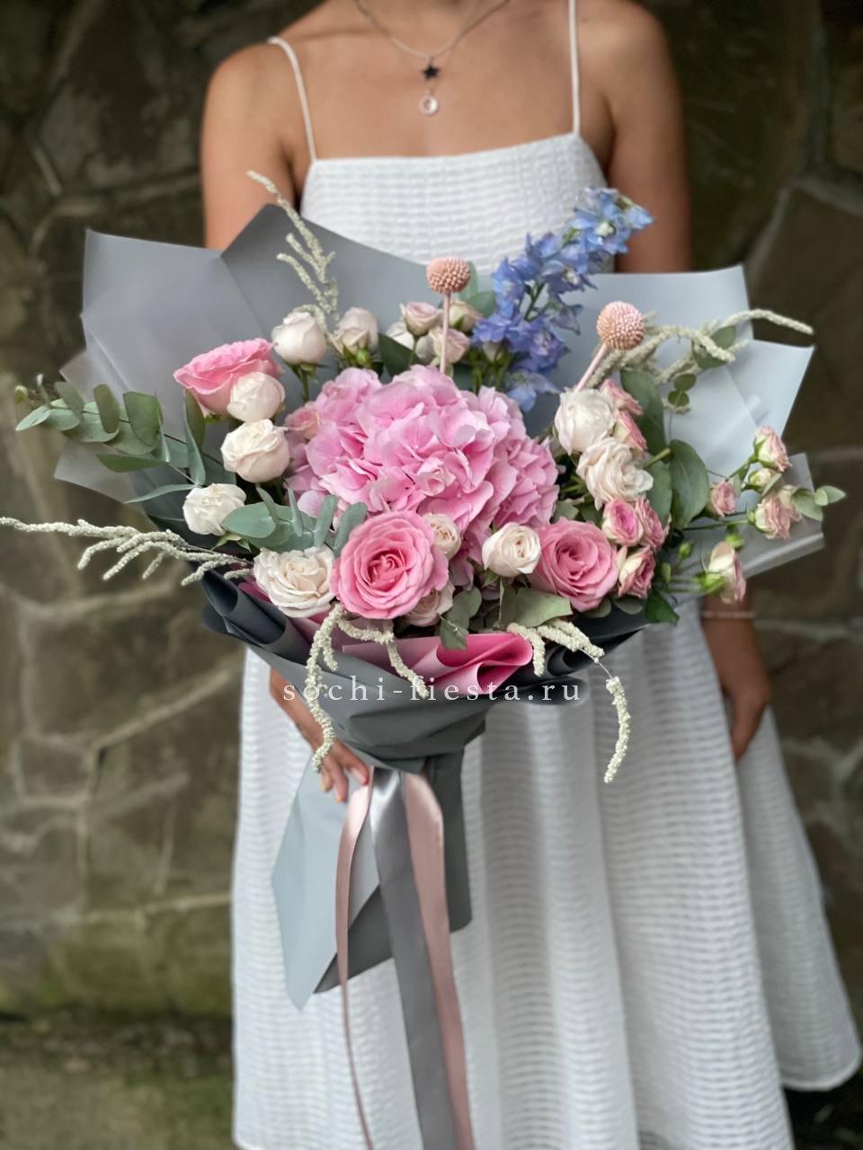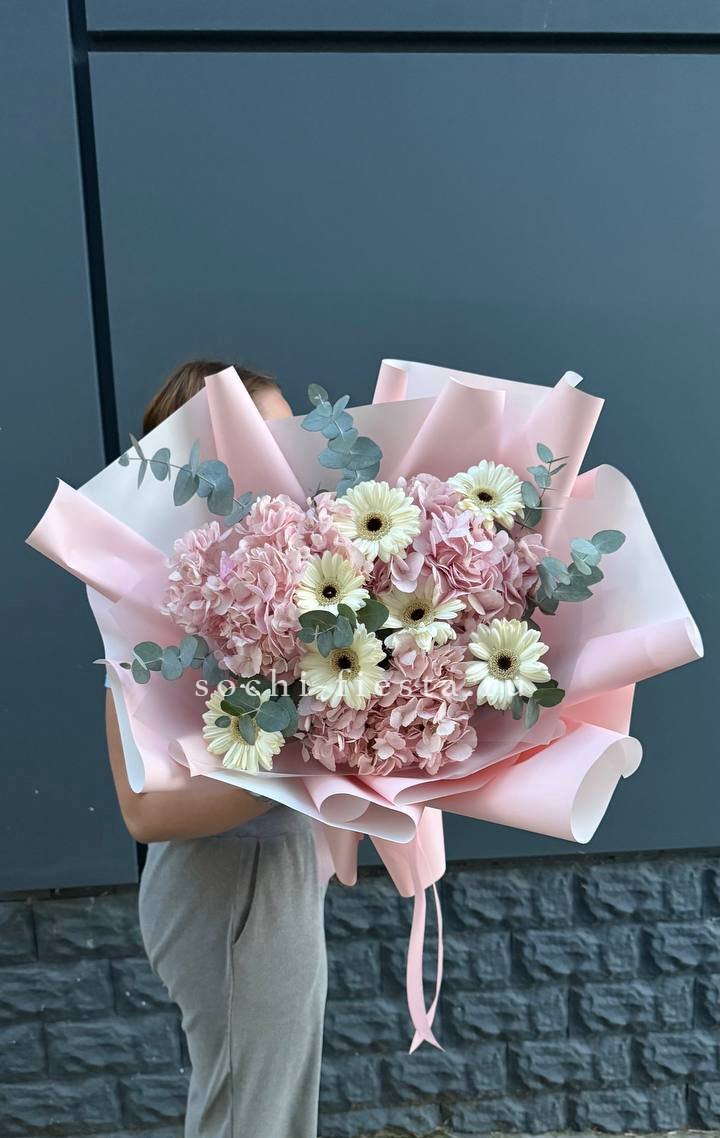 гортензия, диантус, кустовая пионовидная роза, эустома, вспомогательные цветы, эвкалипт, лента, дизайнерская упаковка.