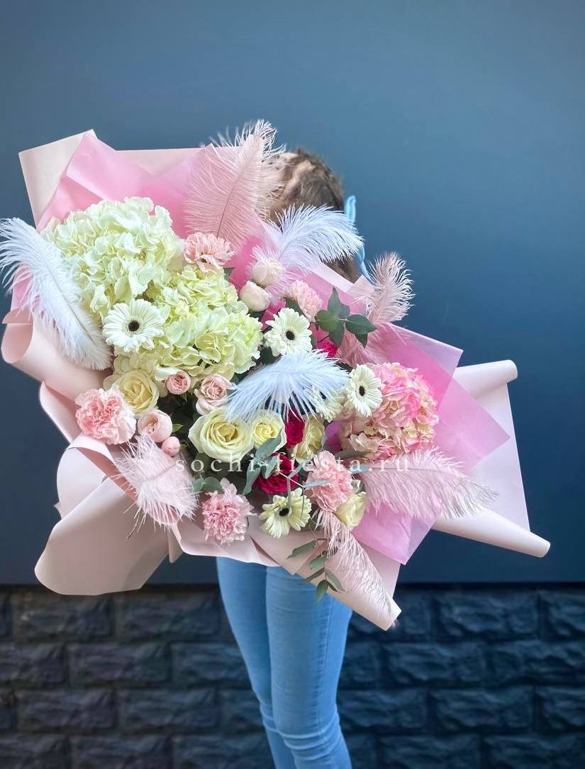 Пышный микс соцветий гортензии, роз и гербер с добавлением перьев и озотамнуса. Авторская композиция объединяет садовую свободу и графичную точность линий.