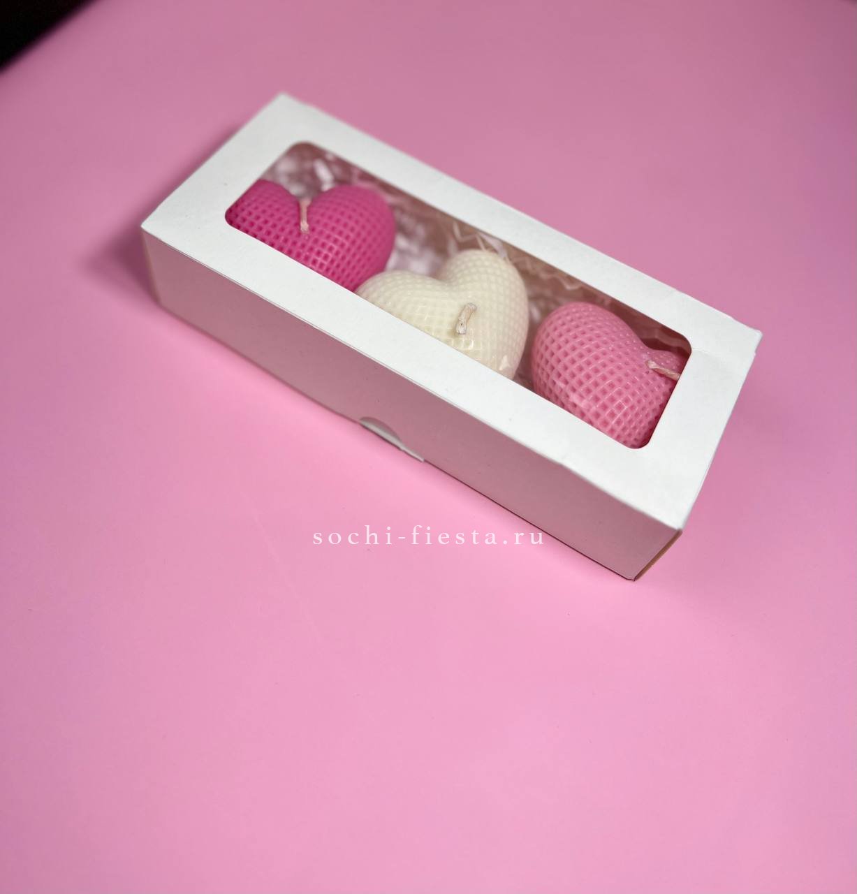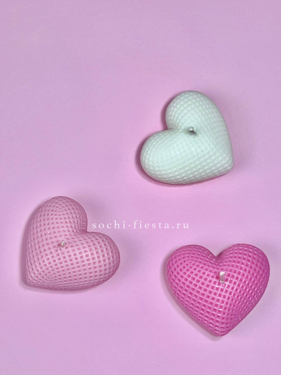Три свечи в форме плюшевых сердец ручной работы. Мягкие линии и романтичная форма создают камерное настроение. Дополнение к цветам, которое продлит впечатление от подарка.