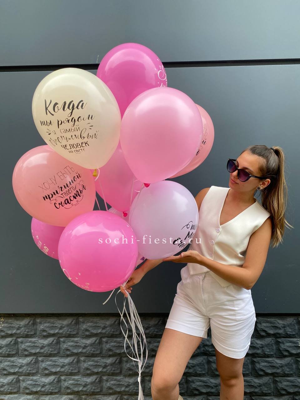 Двенадцать шаров с разными признаниями собраны в лёгкую воздушную группу. Каждая надпись читается отдельно и создаёт личное послание. Простая форма и понятный язык без лишних деталей.
