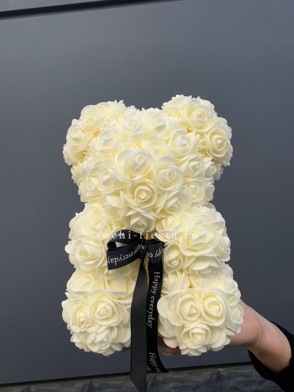 Белый медведь из фоамирана в оттенке шампань напоминает облако из мелких бутонов. Плотная структура материала держит форму и сохраняет первоначальный вид надолго.