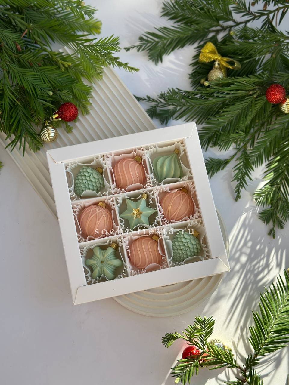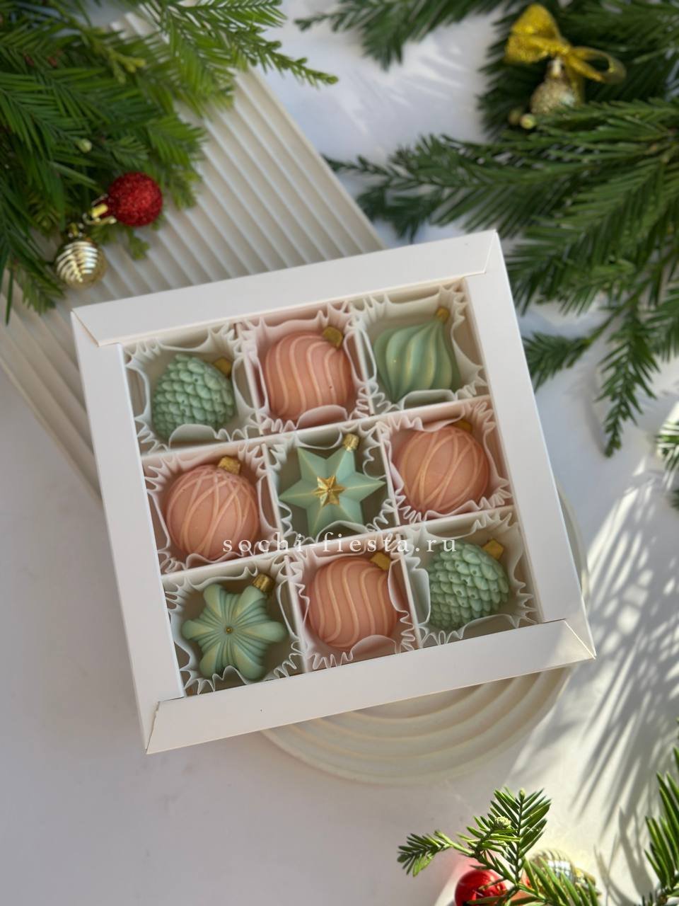 Девять елочных шаров из бельгийского шоколада с авторской росписью. Пастельные тона и ручное декорирование превращают набор в самостоятельный акцент праздничного стола.