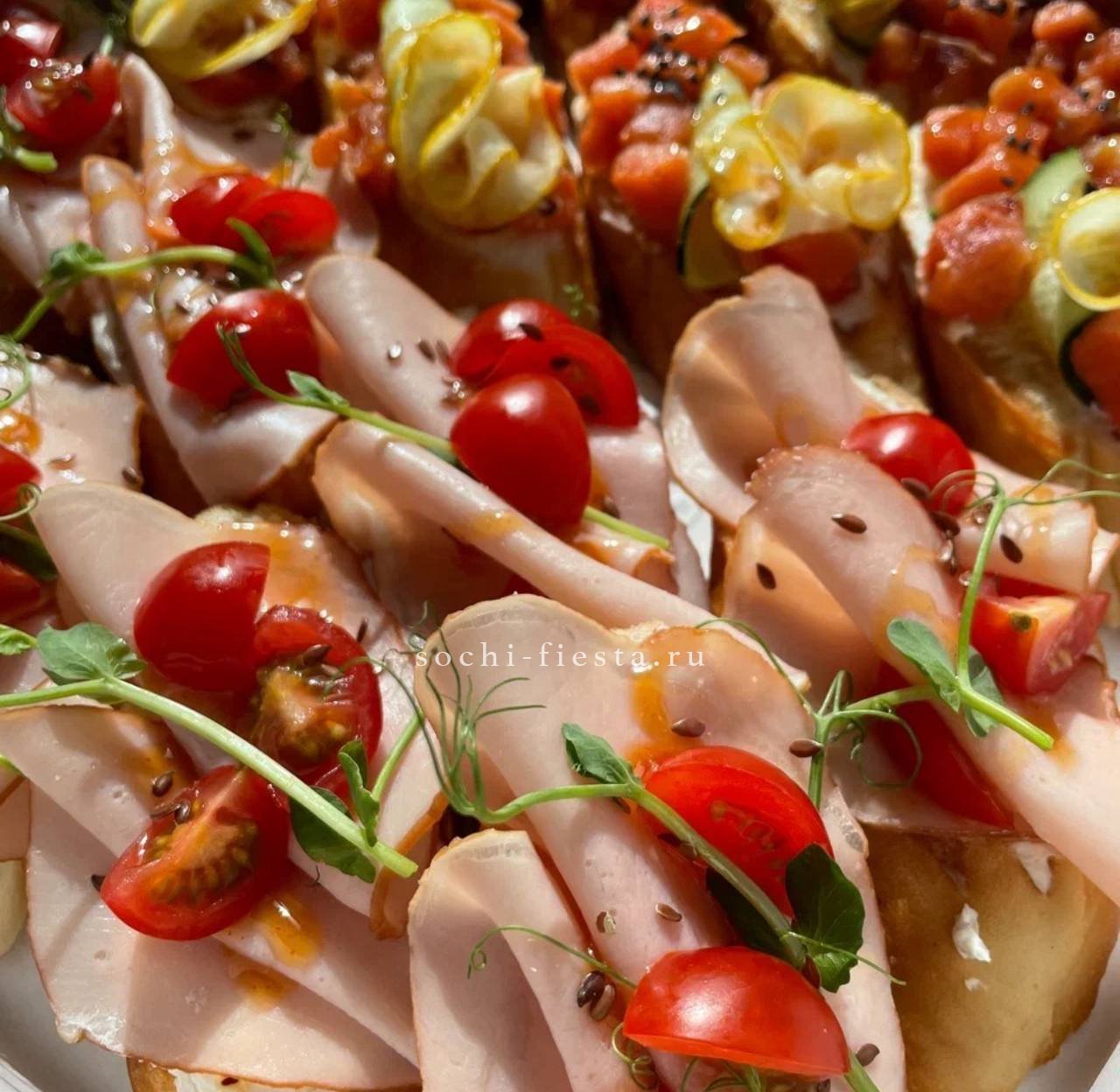 с говядиной и вялеными помидорами- 4 шт. С нежным сливочным паштетом из куриной печени- 4 шт.С семгой и огурцом на крем чиз- 4 шт. С карбонадом, черри и салатом- 4 шт.