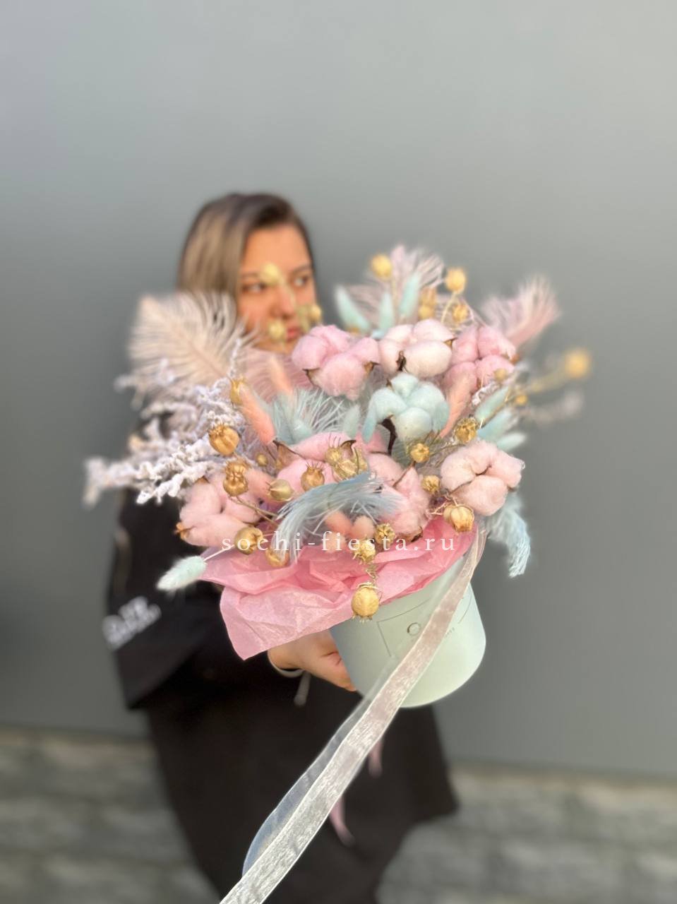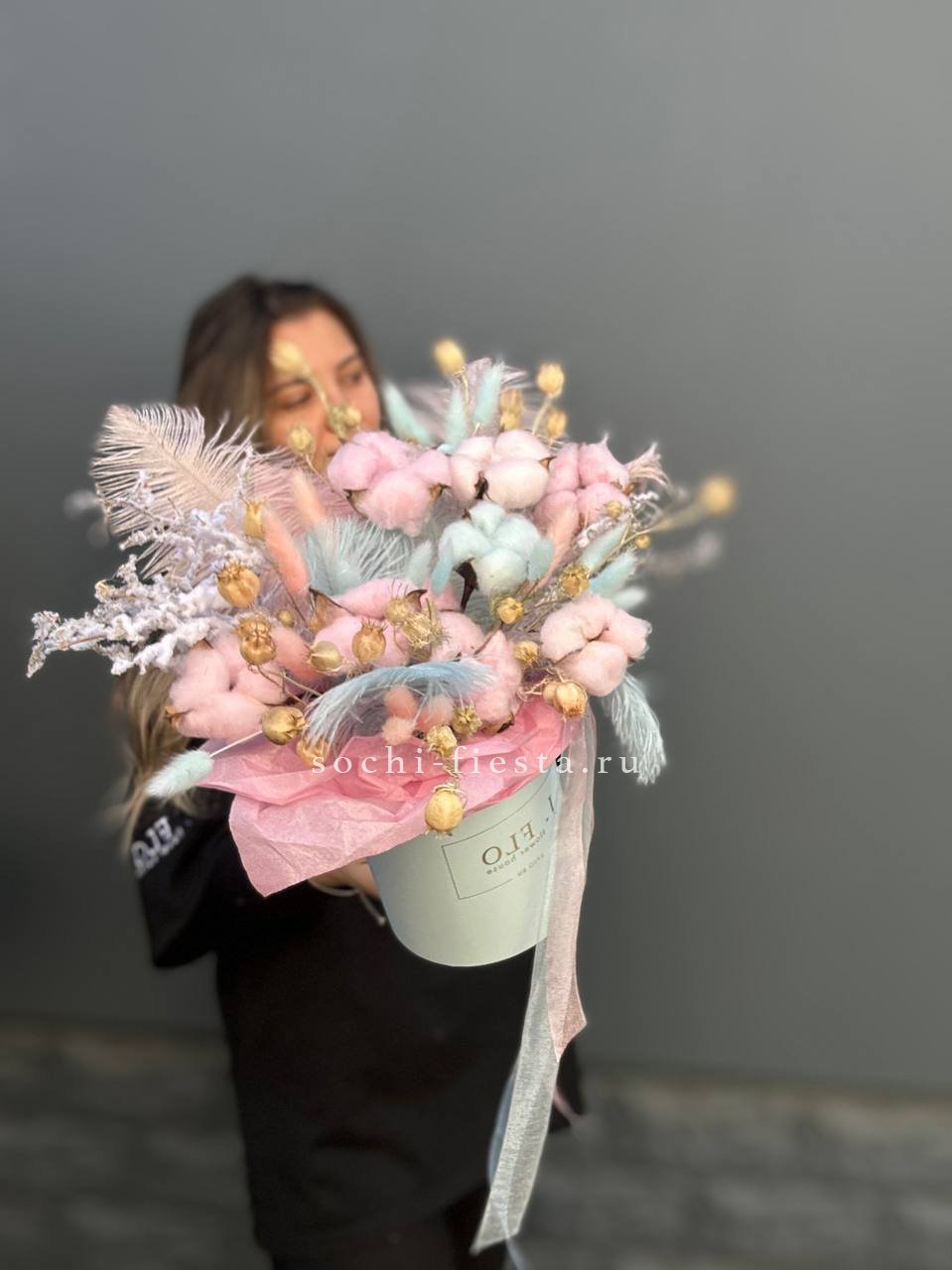Радужные гипсофилы рассыпаются облаком вокруг хлопковых коробочек. Лёгкая воздушная масса создаёт ощущение утреннего сада после дождя.