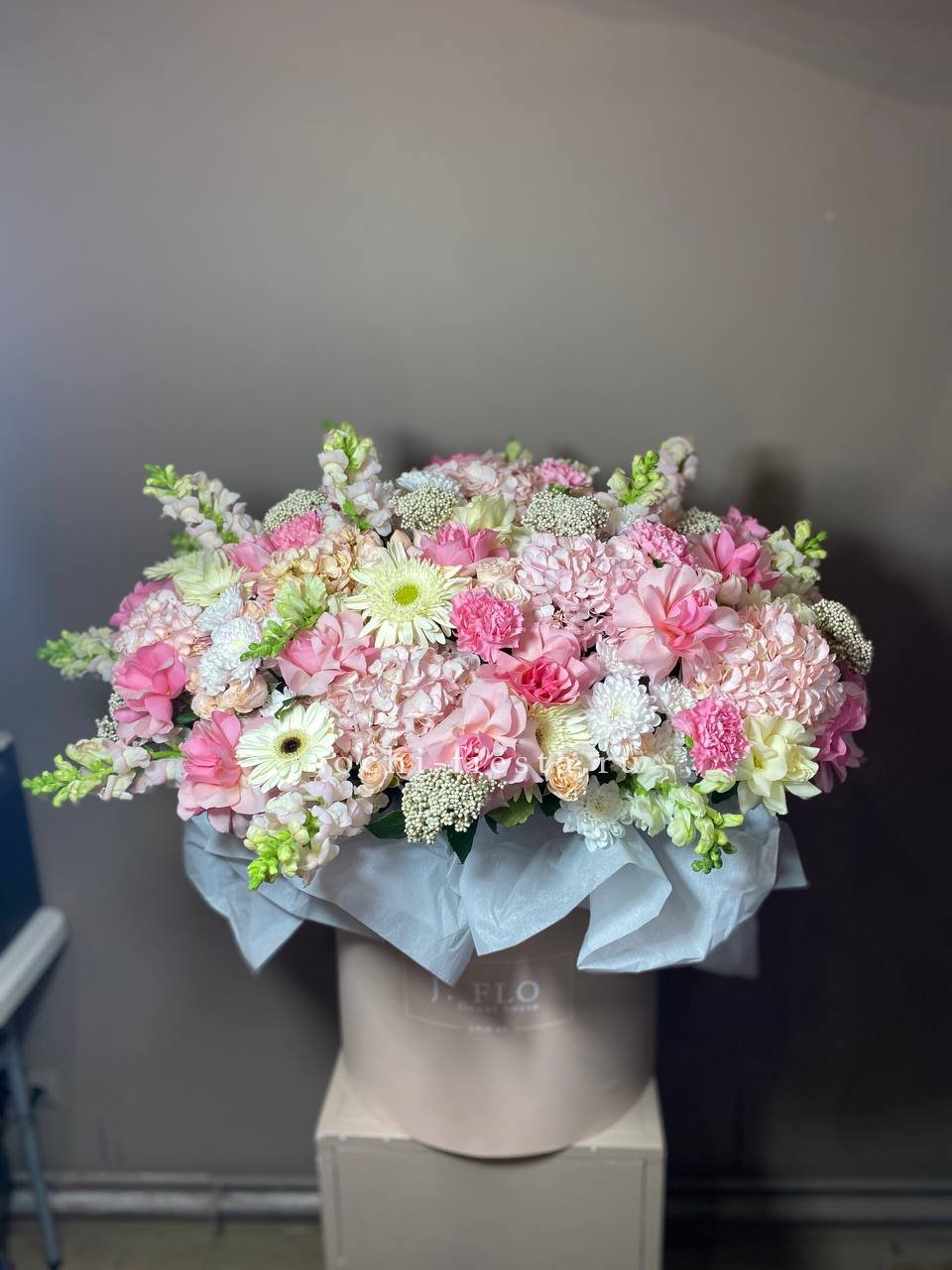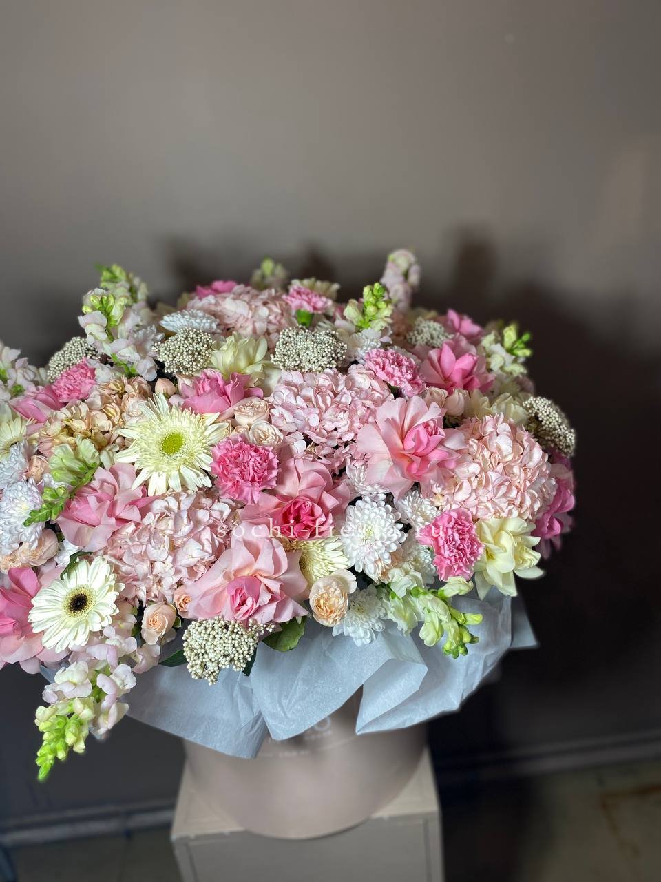 Белые розы и герберы выстраивают светлую основу, а синий дельфиниум задаёт вертикальный ритм всей композиции. Гортензия и озотамнус заполняют пространство между крупными бутонами.