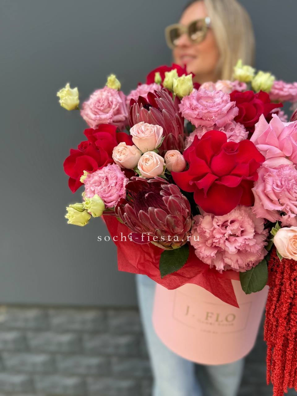 Масштабная композиция в цилиндре собирает пионовидные розы, гортензию и георгины в плотную объемную форму. Высота и диаметр создают выразительное присутствие в интерьере.