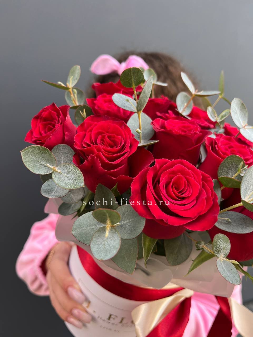 красные розы, эвкалипт, цилиндр D16, лента.