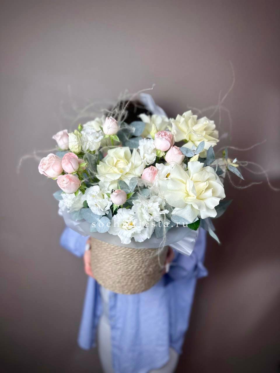 белые розы, диантусы, эустома в джутовом кашпо.