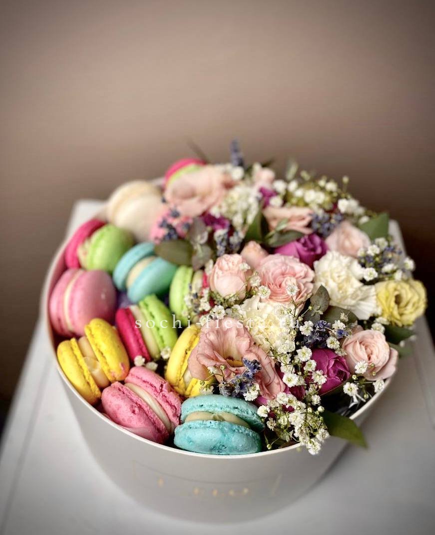 Пышная композиция в круглой коробке сочетает бутоны роз и диантусы со сладким дополнением из одиннадцати макаронс. Светлая гамма и плотное наполнение создают объемное присутствие в интерьере. Формат для тех случаев когда хочется впечатлить.