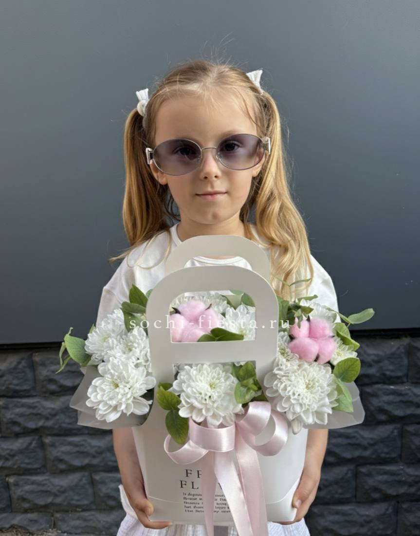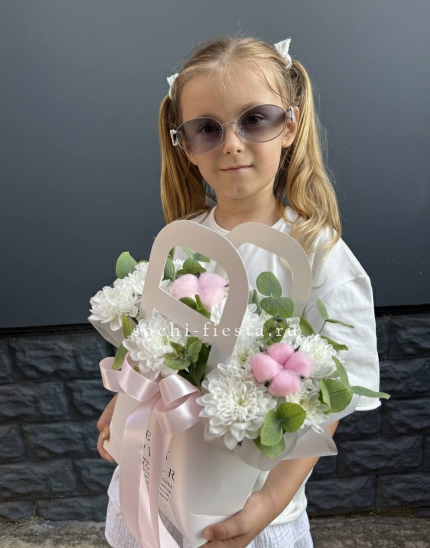 Белые и розовые розы образуют воздушную композицию с мягкими коробочками хлопка и лимониумом. Сумка-кашпо Sofi держит форму и позволяет разместить цветы на столе или полке. Букет выглядит аккуратно и остается свежим долгое время.