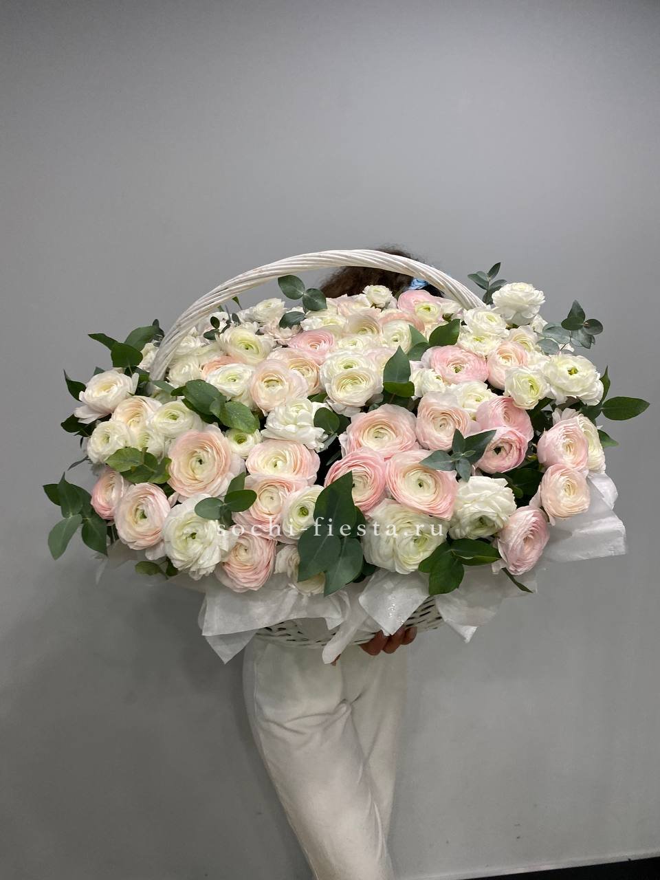 555 роз, зелень (папоротник или эвкалипт, в зависимости от сезона) оформление в корзину. Длина надписи не должна превышать 4 букв.