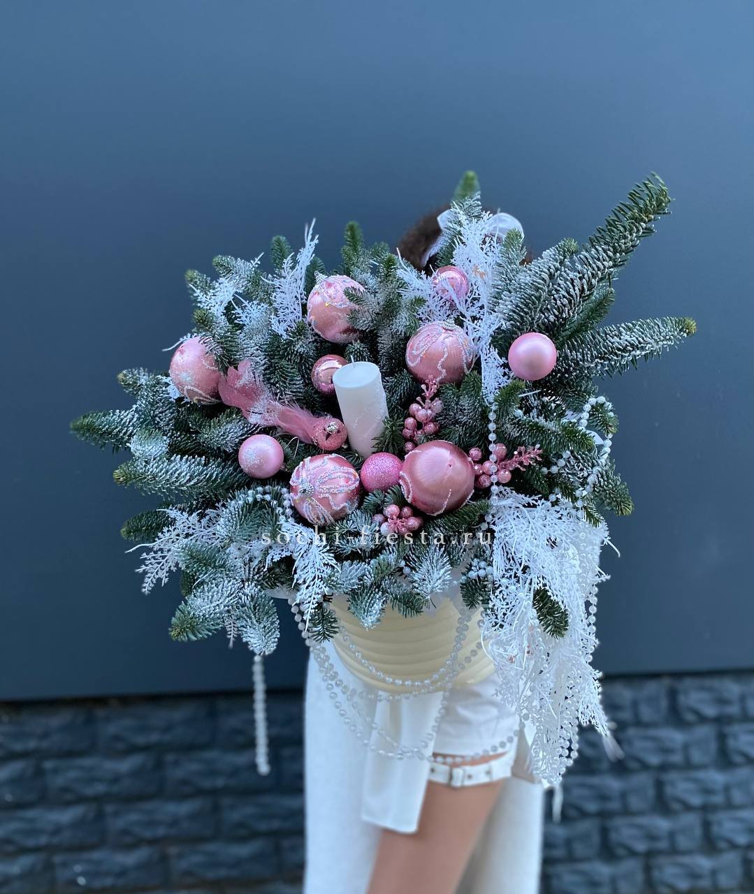 Высокая композиция с двумя свечами и обилием нобилиса создаёт торжественную вертикаль. Глубокий зелёный цвет хвои оттеняет блеск игрушек и мерцание огня в центре.