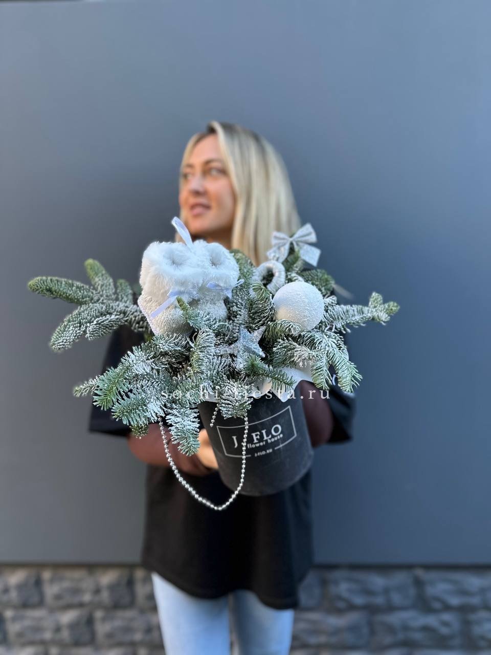 Белоснежные сапожки и хвоя нобилиса собраны в компактную праздничную форму. Матовые шары добавляют объём и завершают зимнюю картину без лишних деталей.