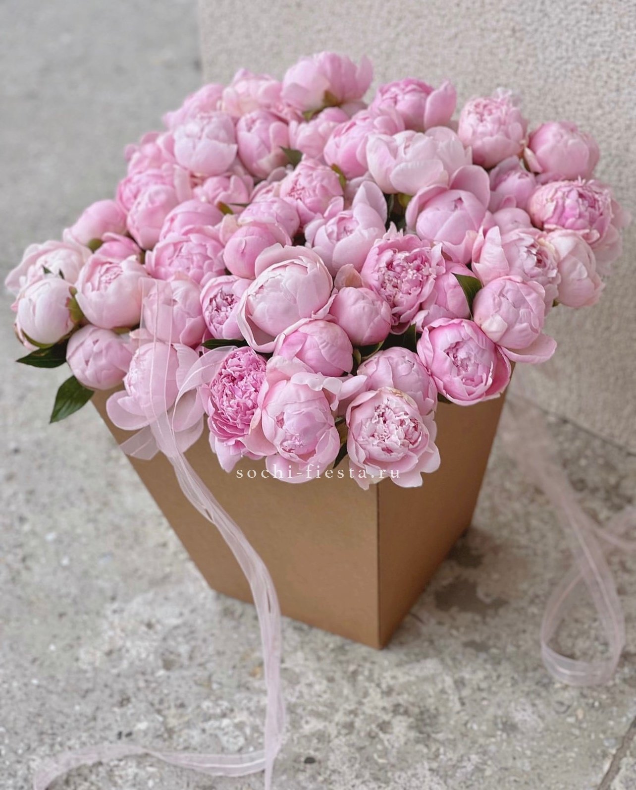 пионы, лента, транспортная коробка крафт.