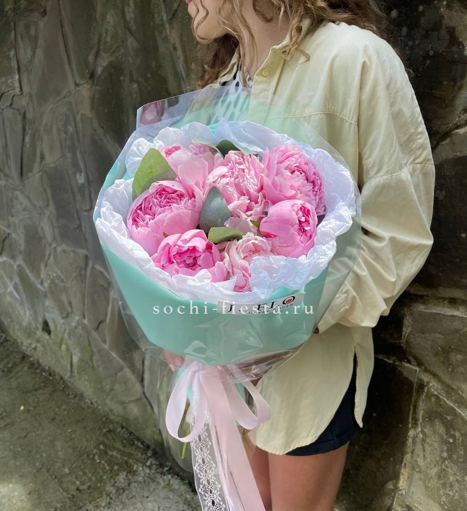 7 розовых пионов сорта Сара бернар, эвкалипт, лента, фоамиран, тишью.