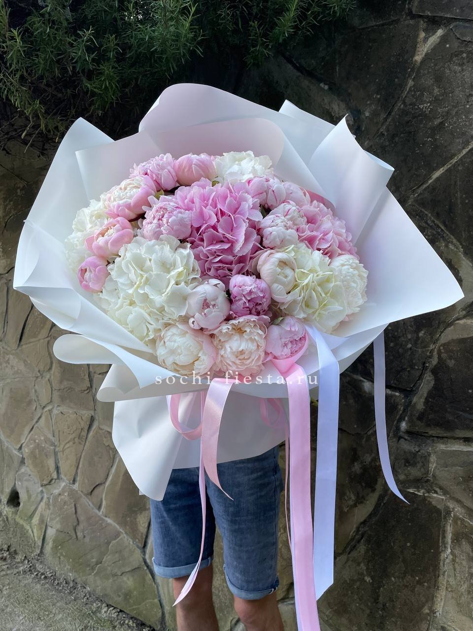Голландские пионы и пышные шапки гортензий собраны в многослойную композицию. Разная фактура цветов создаёт визуальную игру между плотными бутонами и воздушными соцветиями.