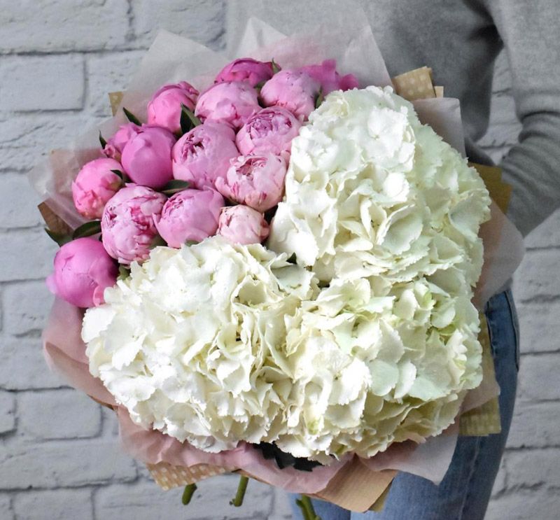 15 розовых пионов, 3 белые гортензии, лента, упаковка на выбор.