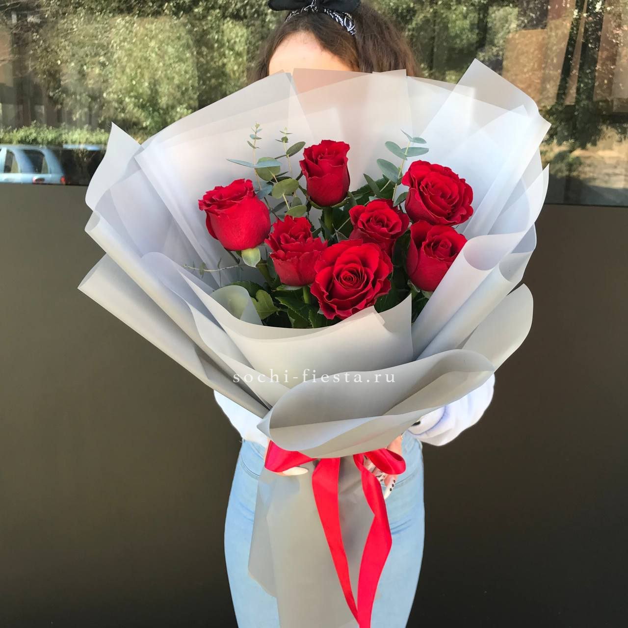 Сто один бутон сорта Лолита раскрывается бархатными лепестками глубокого красного цвета. Высокие стебли формируют объемную композицию с выразительным силуэтом. Классика в современной подаче.