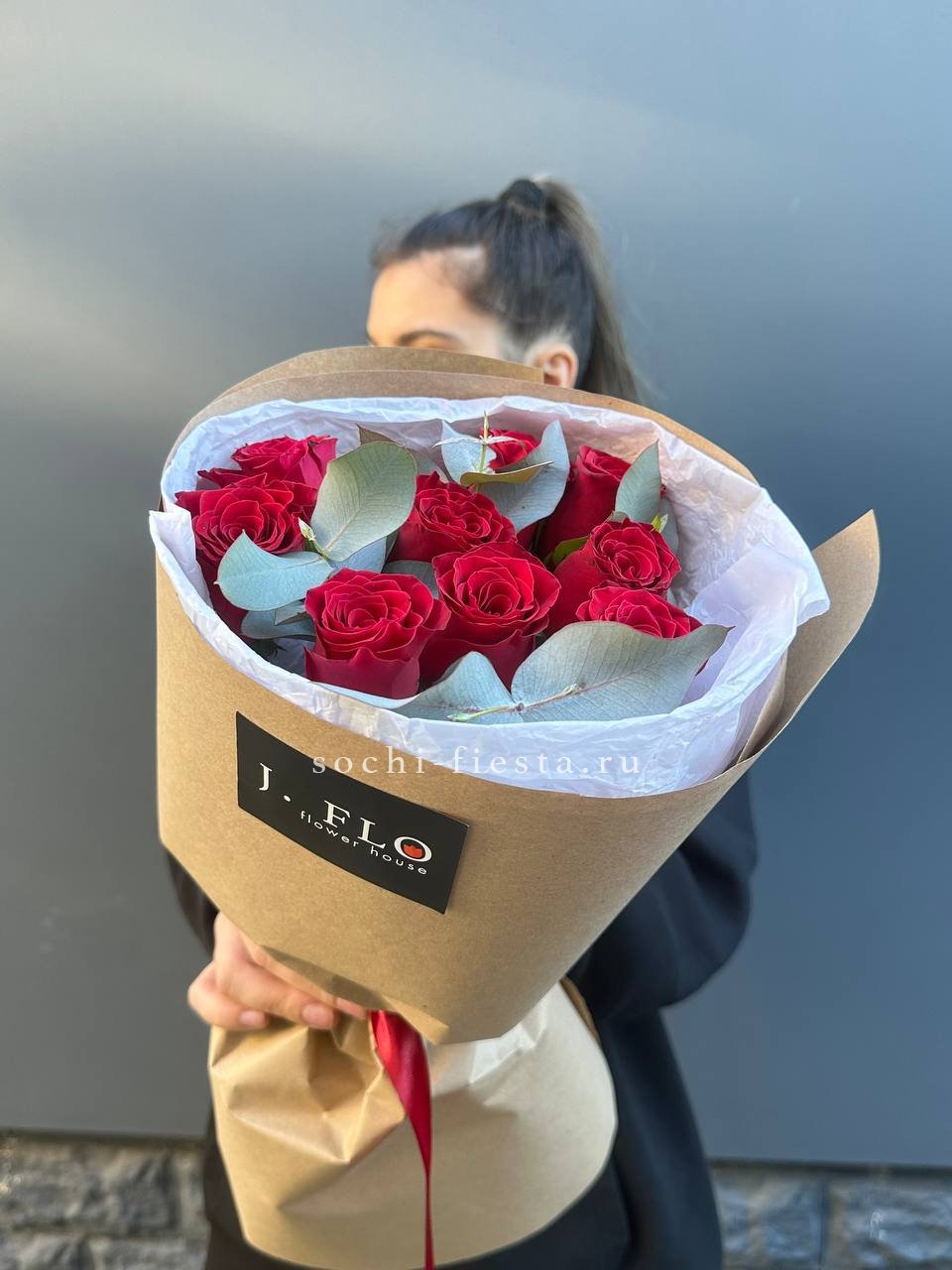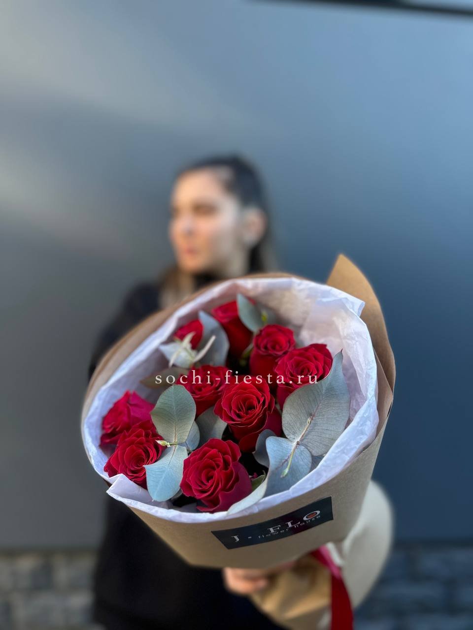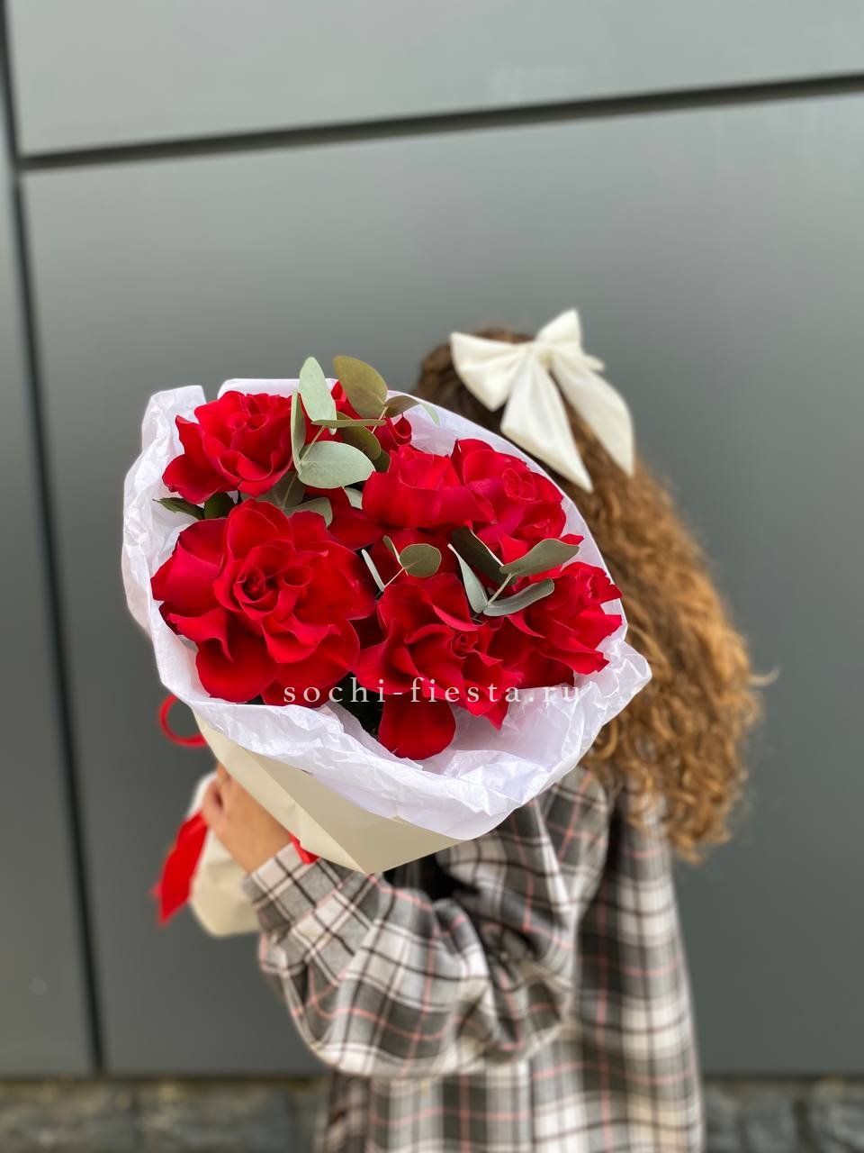 Французские розы с вывернутыми лепестками образуют пышную фактуру и глубину. Эвкалипт оттеняет насыщенность красного и придаёт букету свежесть.