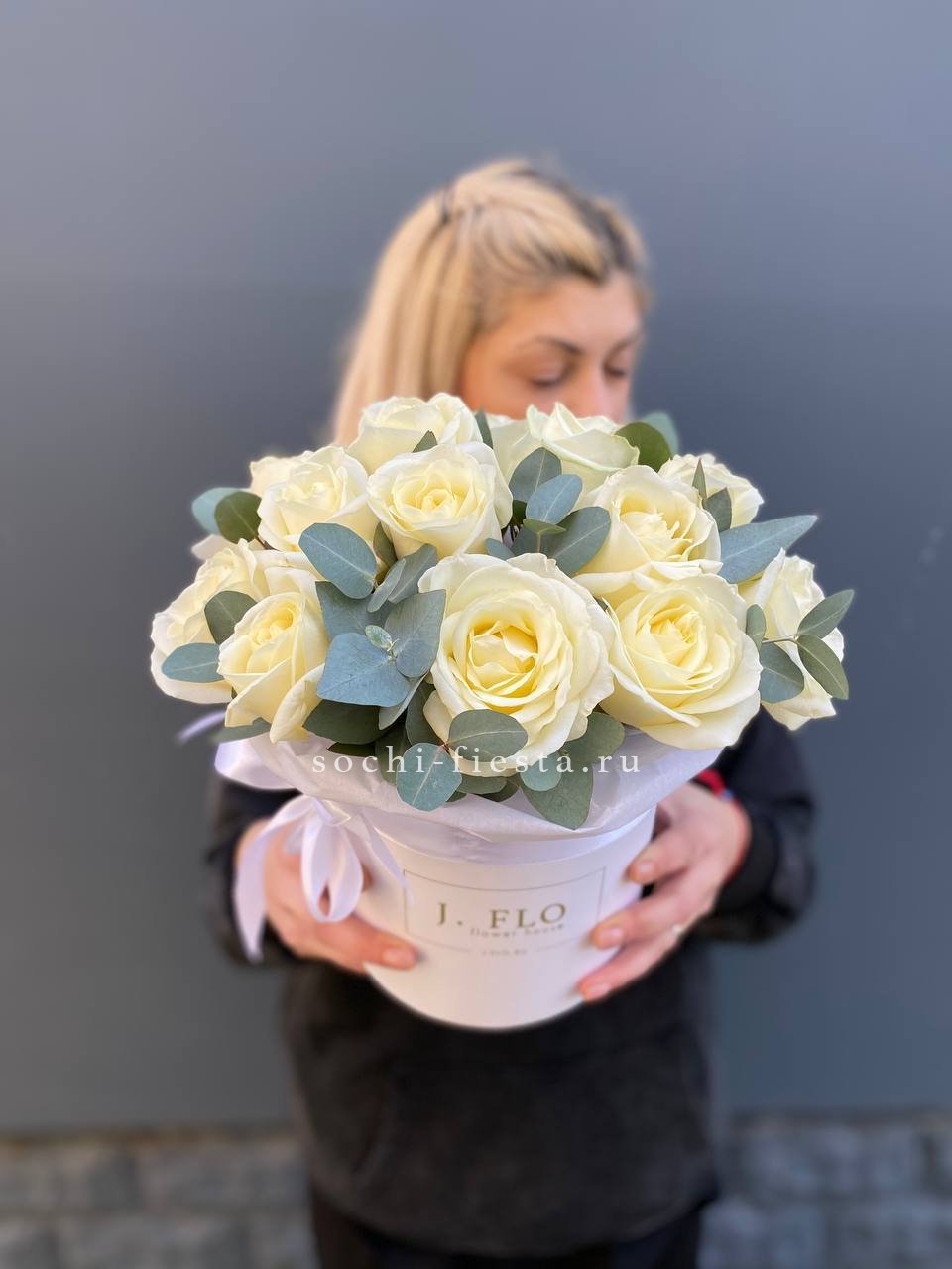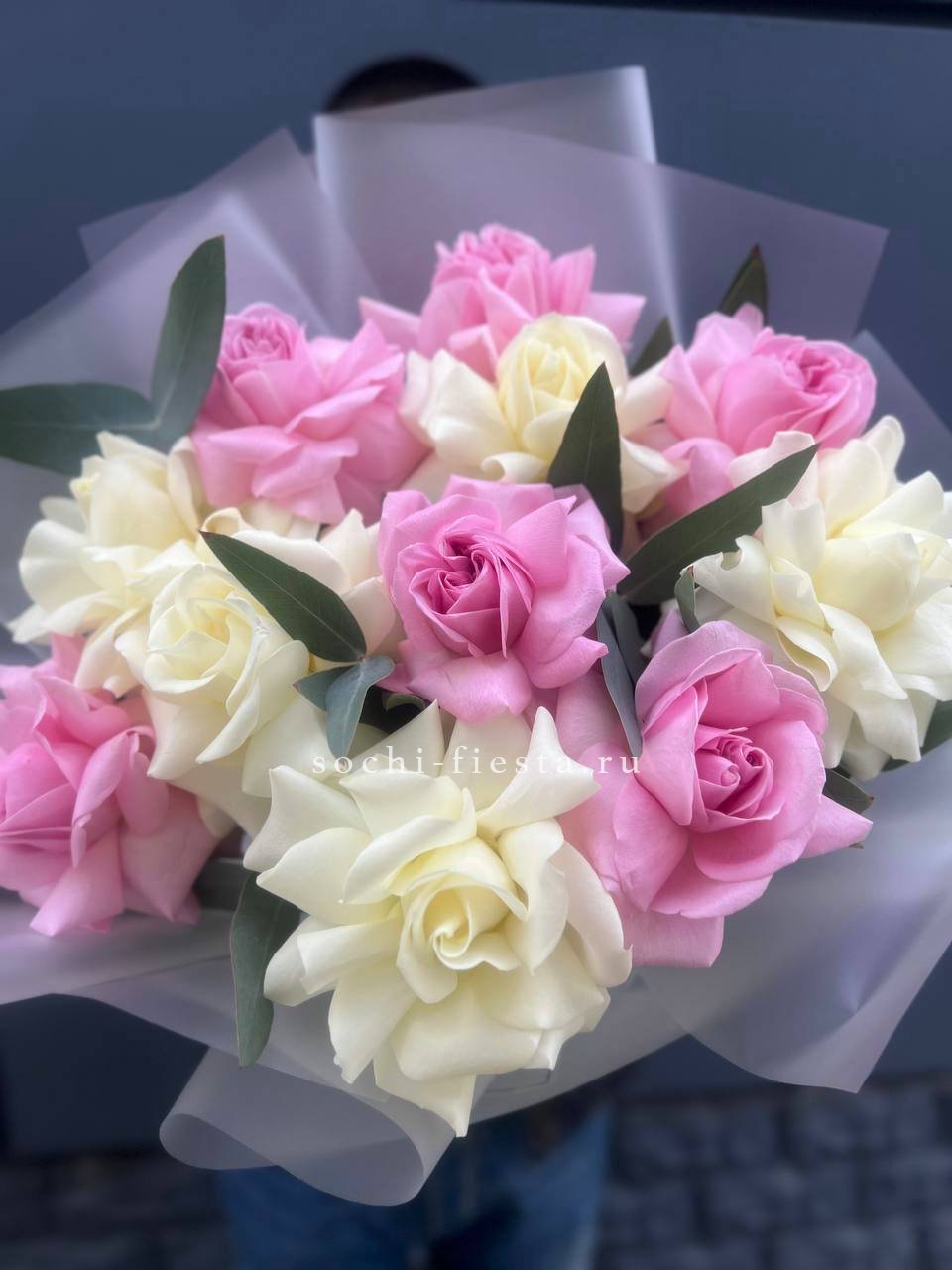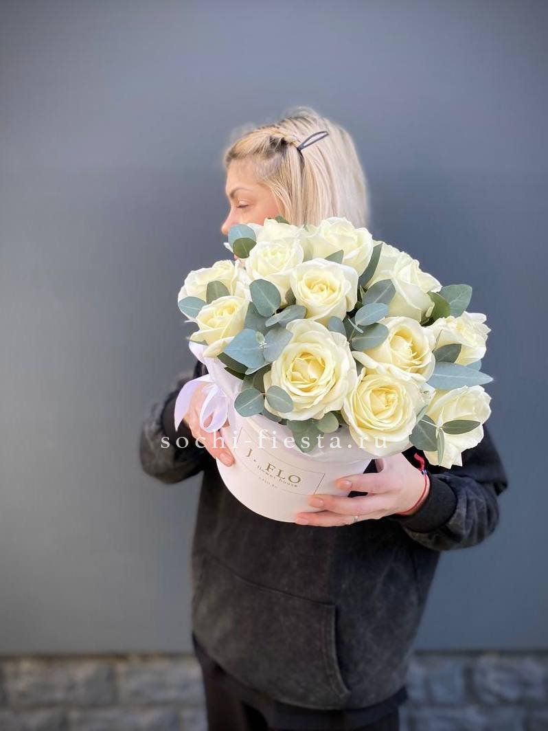 Переход от белого к розовому создаёт мягкую игру тонов. Эвкалипт добавляет фактурности и свежести зелени. Одиннадцать роз складываются в гармоничную композицию с лёгким характером.