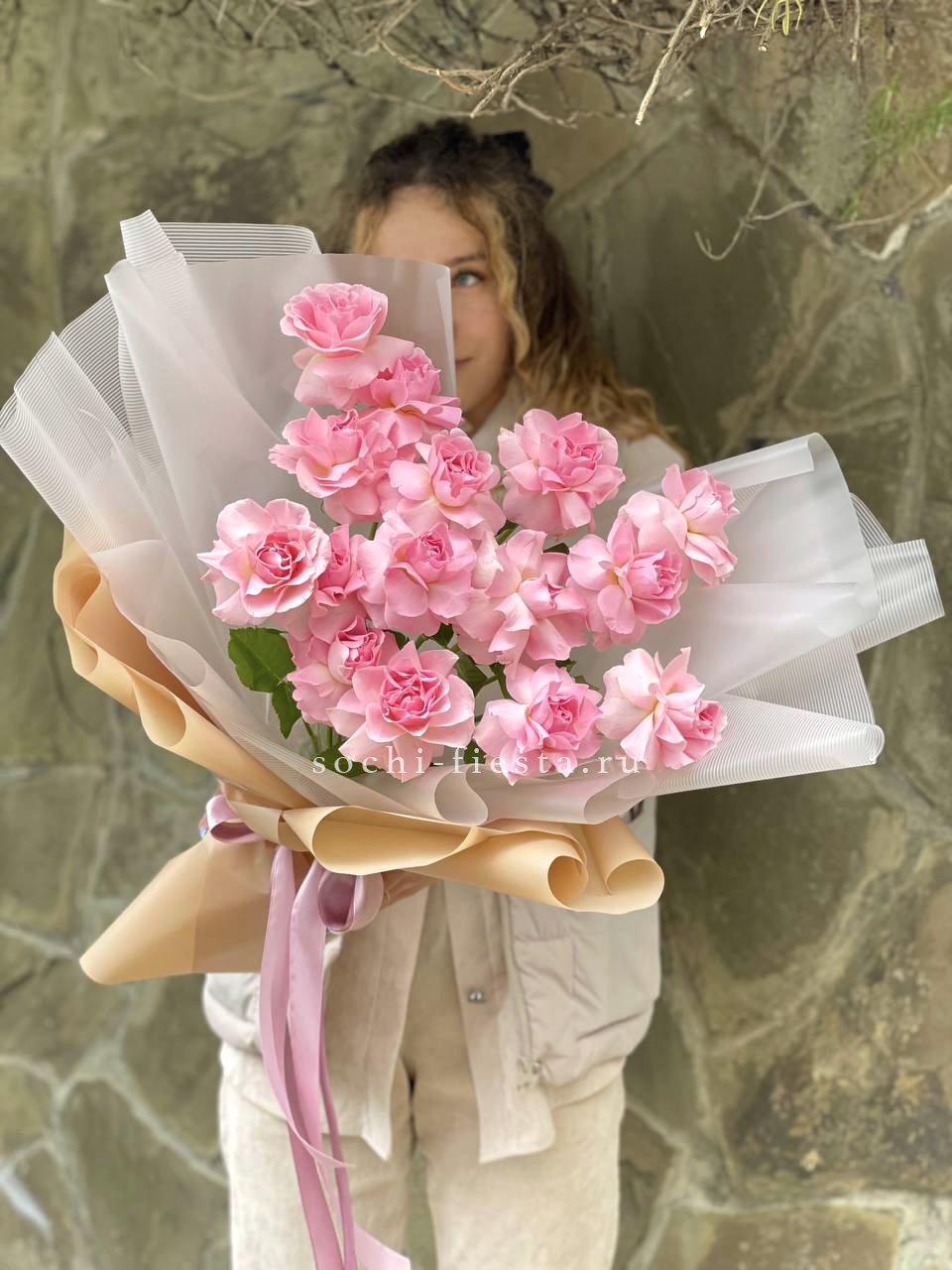 Пятнадцать французских роз Pink Dream с характерно вывернутыми лепестками. Фактура бутонов открывает глубину цвета и добавляет объем всей композиции.
