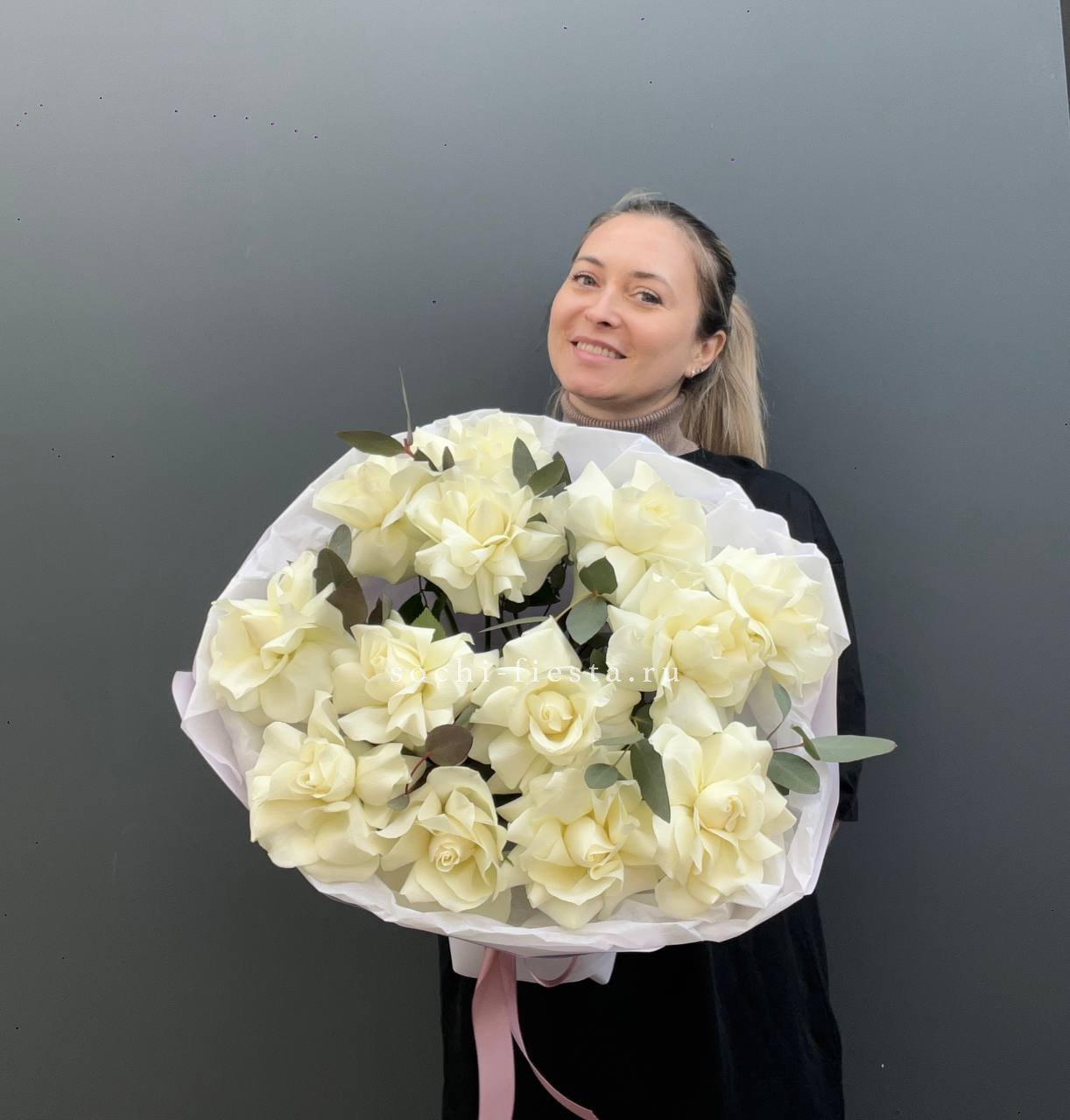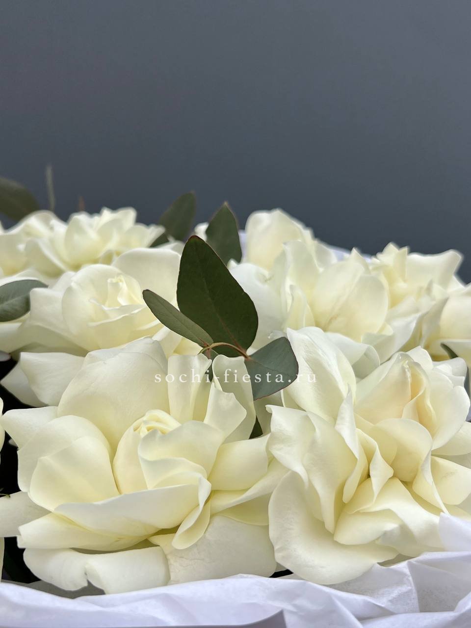 Пятьдесят один белоснежный бутон создаёт объёмное облако с мягкими переходами света и тени. Голландские розы держат форму и заполняют пространство плотной текстурой лепестков.