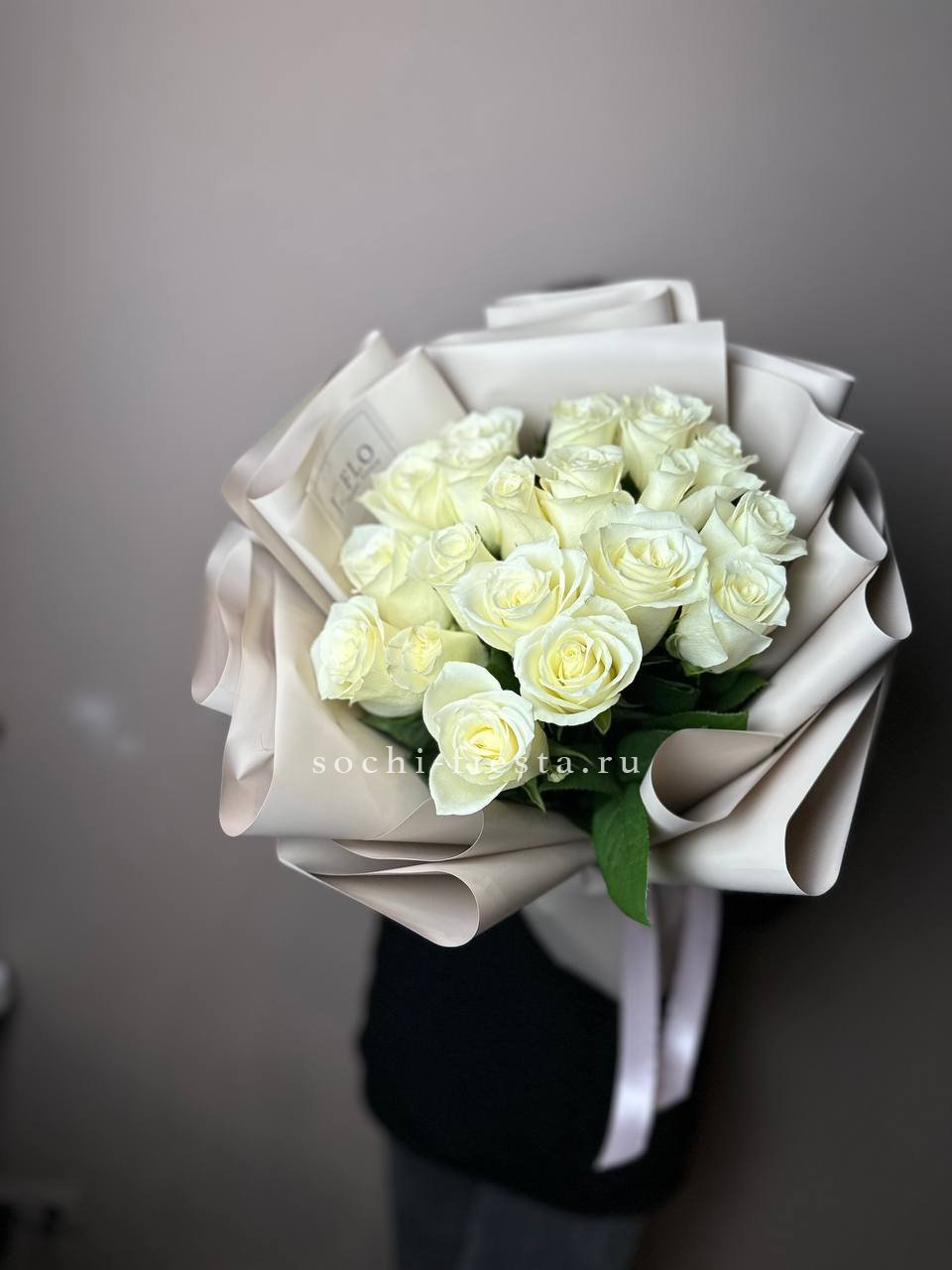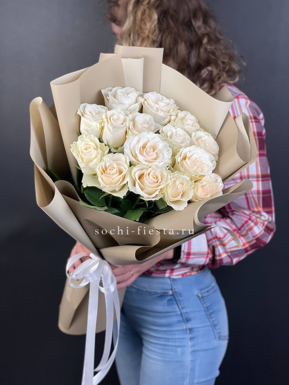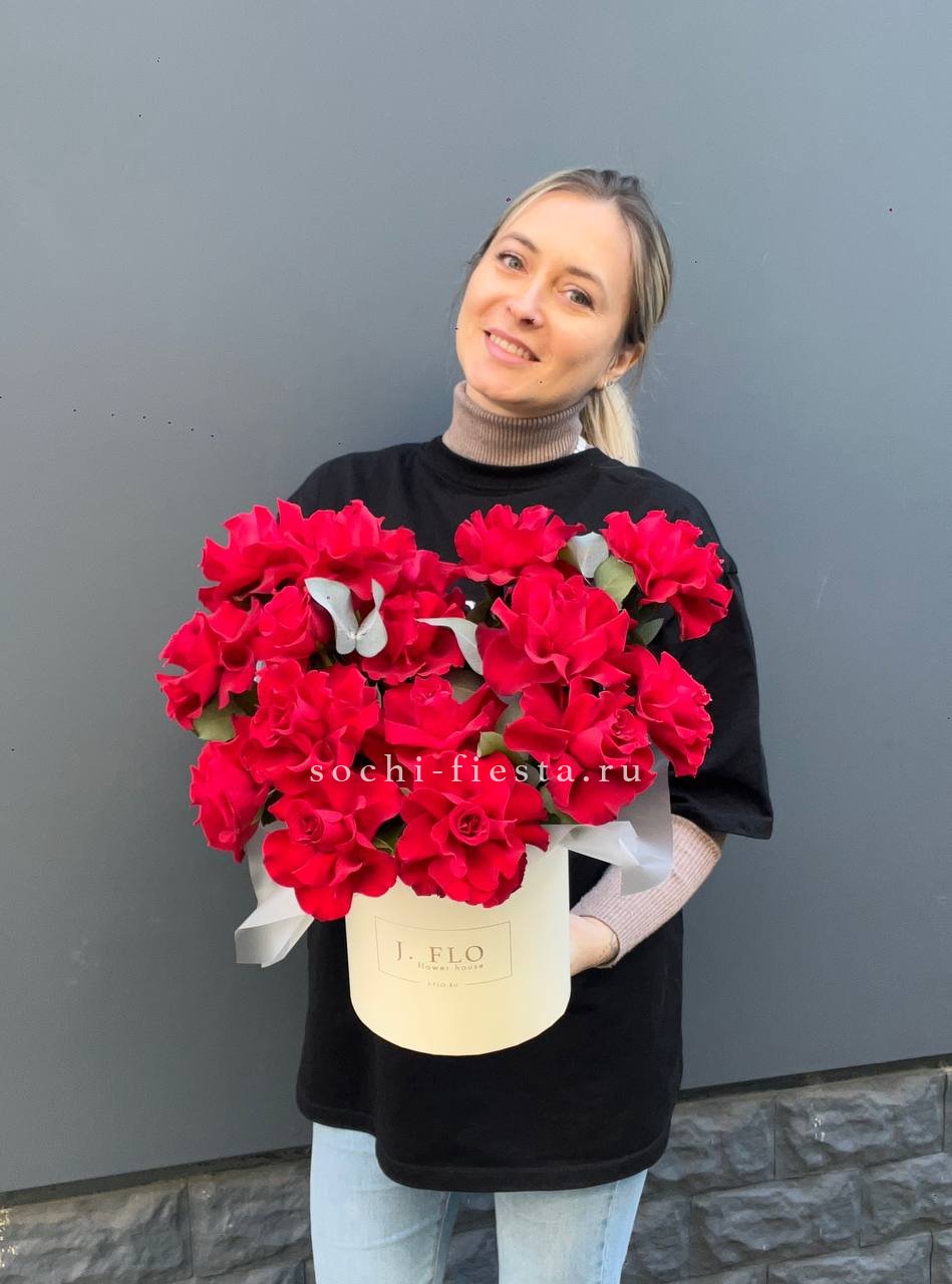 Пятнадцать роз на удлиненных стеблях выглядят графично и современно. Кремовые лепестки сохраняют свежесть и форму в течение долгого времени.
