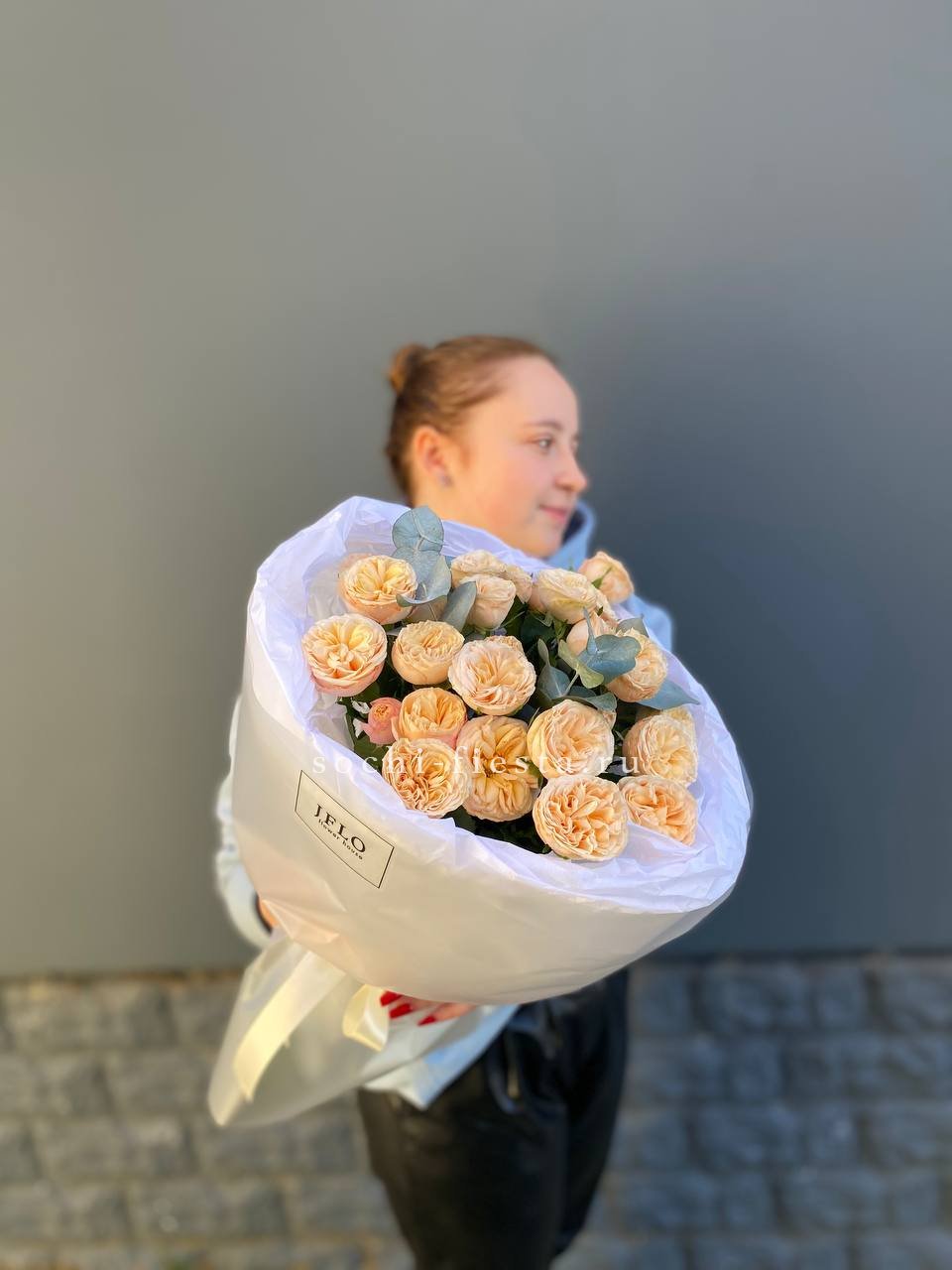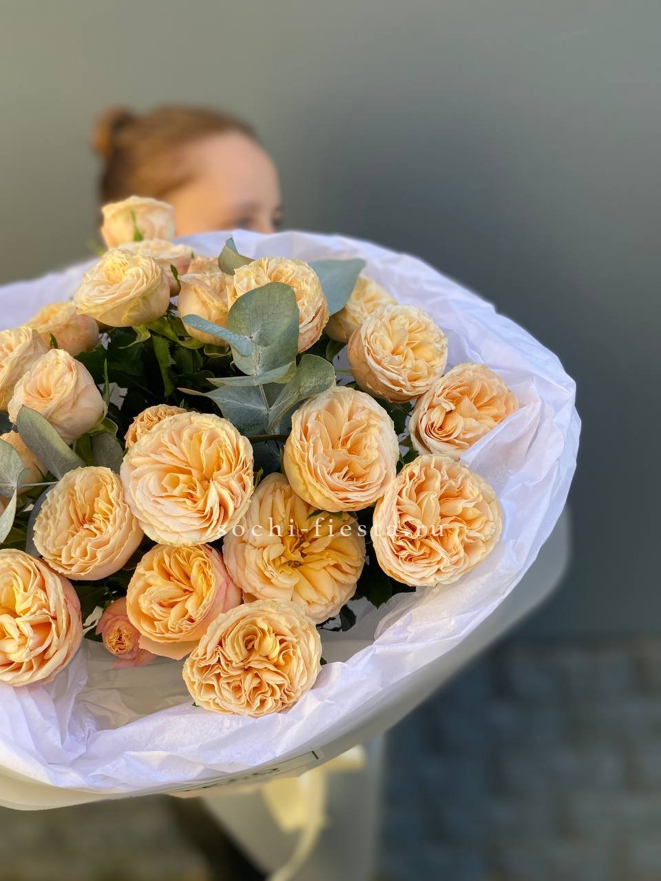 Семь кустовых роз с ветками эвкалипта создают лёгкую композицию, где зелень обрамляет каждый бутон и добавляет воздуха между цветами. Простая сборка с естественным ритмом и свежим характером.