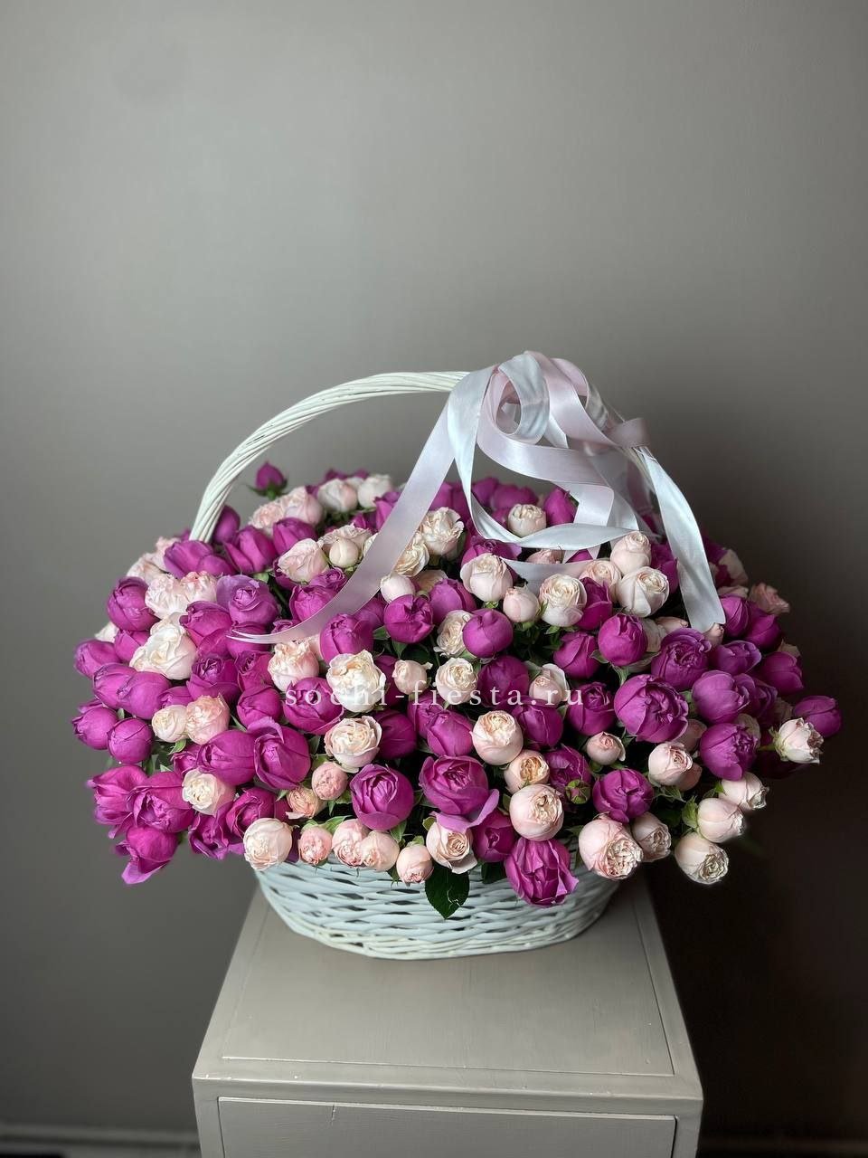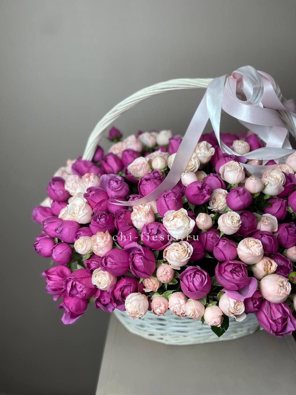 Двести один бутон двух сортов заполняют корзину до краёв. Бомбастик и Мисти Баблс чередуются оттенками, создавая мягкие переливы в общей массе пышных соцветий без единого просвета.